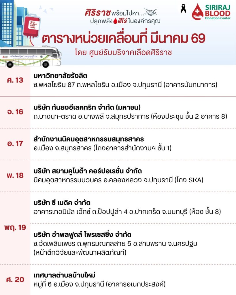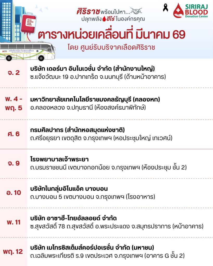 ศูนย์รับบริจาคเลือดศิริราช ออกหน่วยรับบริจาคเลือดเคลื่อนที่ ประจำเดือน มีนาคม 2569