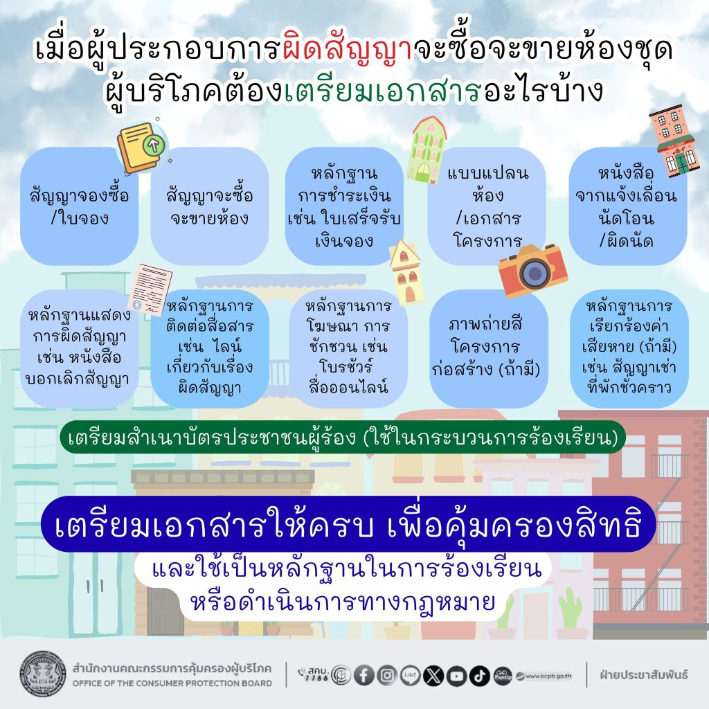 สำนักงานคณะกรรมการคุ้มครองผู้บริโภค เมื่อผู้ประกอบการผิดสัญญาจะซื้อจะขายห้องชุด ผู้บริโภคต้องเตรียมเอกสารอะไรบ้าง