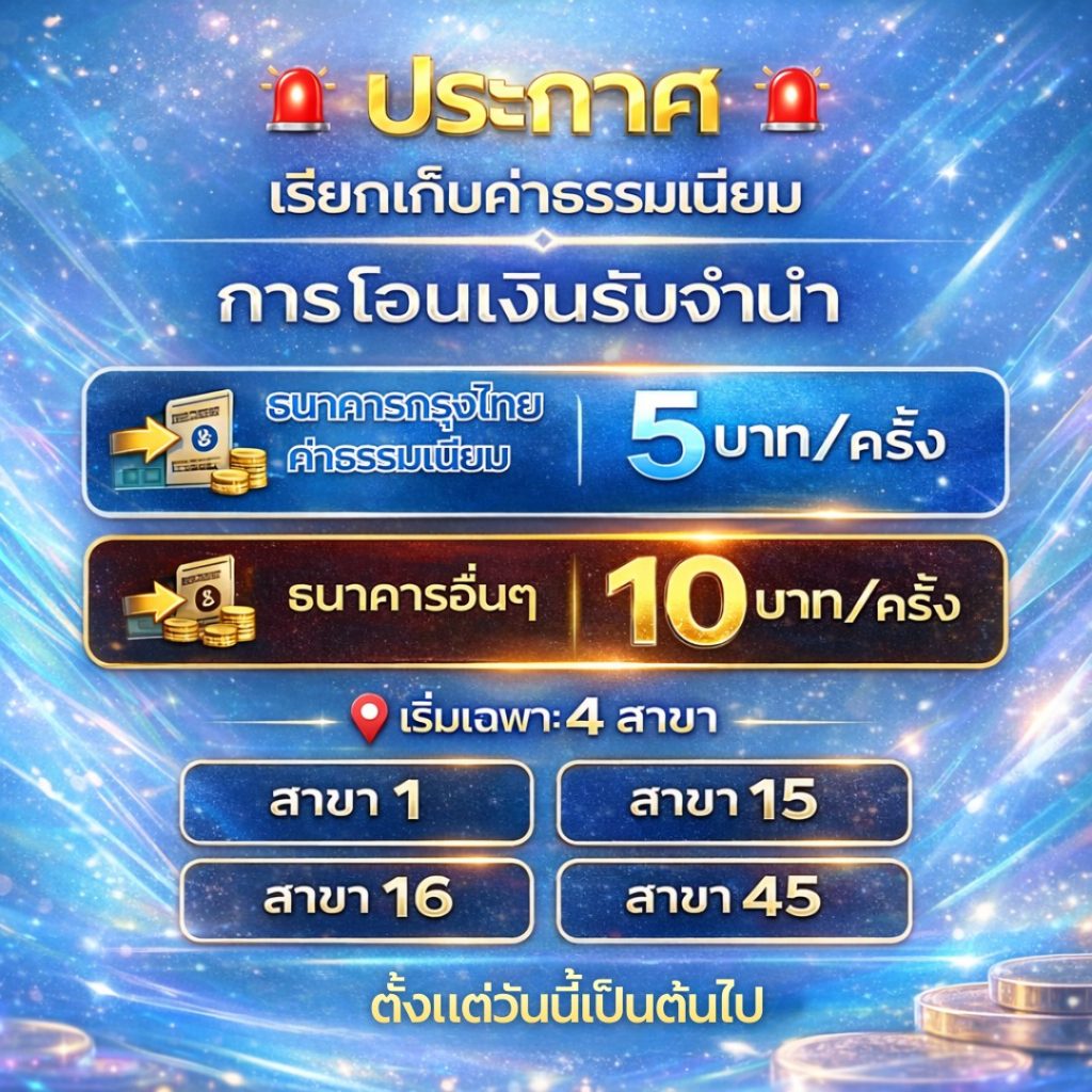 สถานธนานุเคราะห์ แจ้งตั้งแต่บัดนี้เป็นต้นไป ธนาคารอื่น ๆ จะเรียกเก็บค่าธรรมเนียมการโอนเงิน ในอัตรา 10 บาทต่อครั้ง