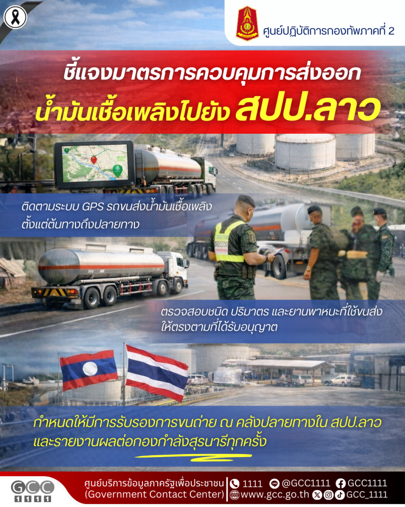 ตามที่ได้มีการกำหนดมาตรการเกี่ยวกับการส่งออกน้ำมันเชื้อเพลิงไปยังสาธารณรัฐประชาธิปไตยประชาชนลาว (สปป.ลาว) เพื่อลดผลกระทบที่อาจเกิดกับประชาชนลาว และเพื่อให้การดำเนินการเป็นไปด้วยความเรียบร้อย โปร่งใส และสอดคล้องกับแนวทางด้านความมั่นคงนั้น กองทัพภาคที่ 2 ขอเรียนชี้แจงว่า ได้มีการระงับการส่งออกน้ำมันเชื้อเพลิงตั้งแต่วันที่ 14 ธันวาคม 2568 เป็นต้นมา และปัจจุบันกองทัพบกได้อนุมัติกรอบแนวทางการควบคุมการส่งออกน้ำมันเชื้อเพลิง ให้อยู่ภายใต้มาตรการควบคุมที่เหมาะสมและรัดกุม