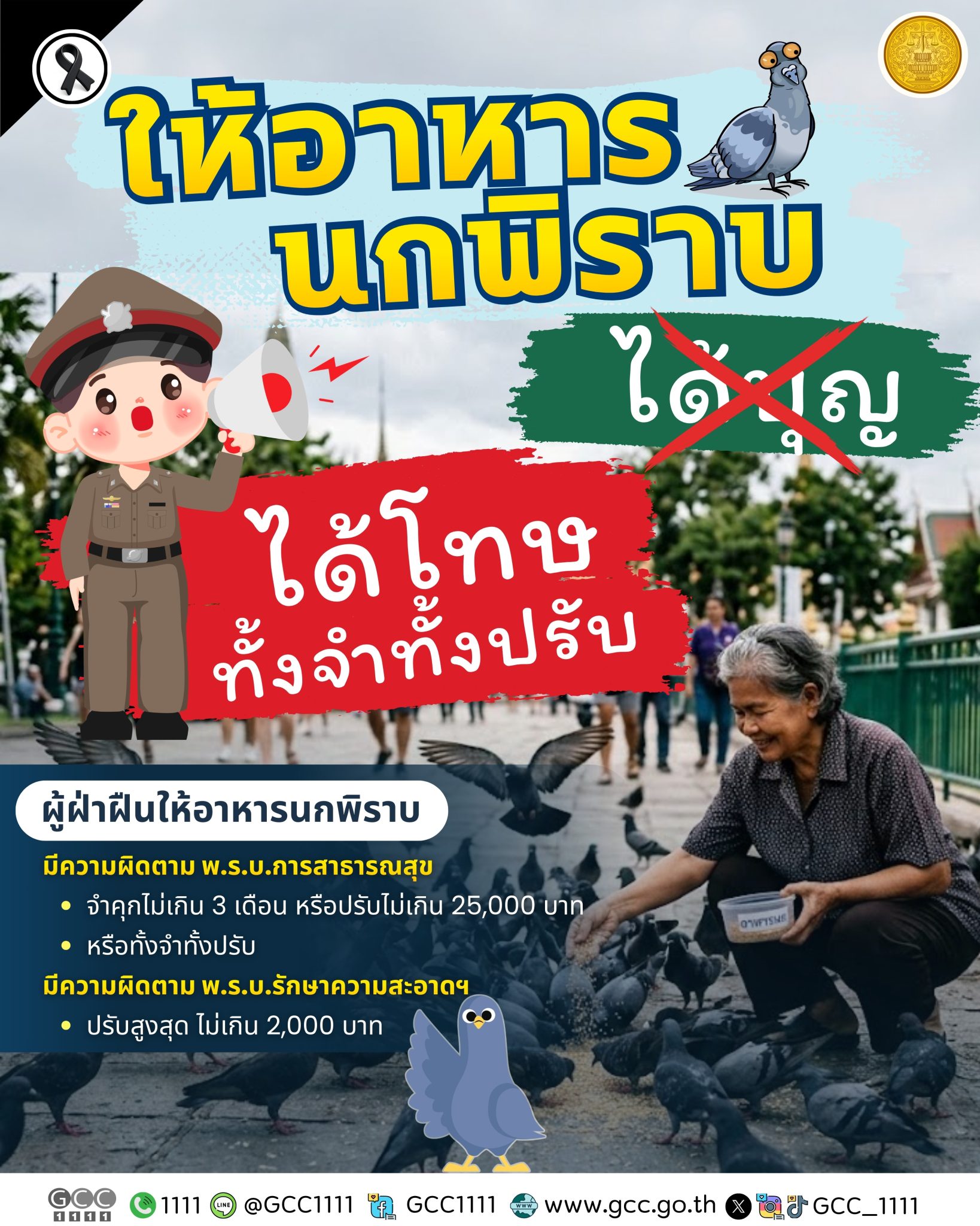 - ข้อหา: การให้อาหารนกพิราบจนเป็นแหล่งเพาะพันธุ์เชื้อโรค หรือสร้างความสกปรก ถือเป็น “เหตุรำคาญ” ตามมาตรา 25