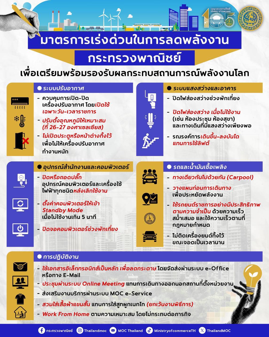 กระทรวงพาณิชย์เดินหน้ามาตรการลดการใช้พลังงานภายในหน่วยงาน เพื่อเตรียมความพร้อมรองรับสถานการณ์พลังงานโลก และส่งเสริมการใช้พลังงานอย่างมีประสิทธิภาพ กระทรวงพาณิชย์ได้กำหนดแนวทางการประหยัดพลังงานในด้านต่าง ๆ อาทิ