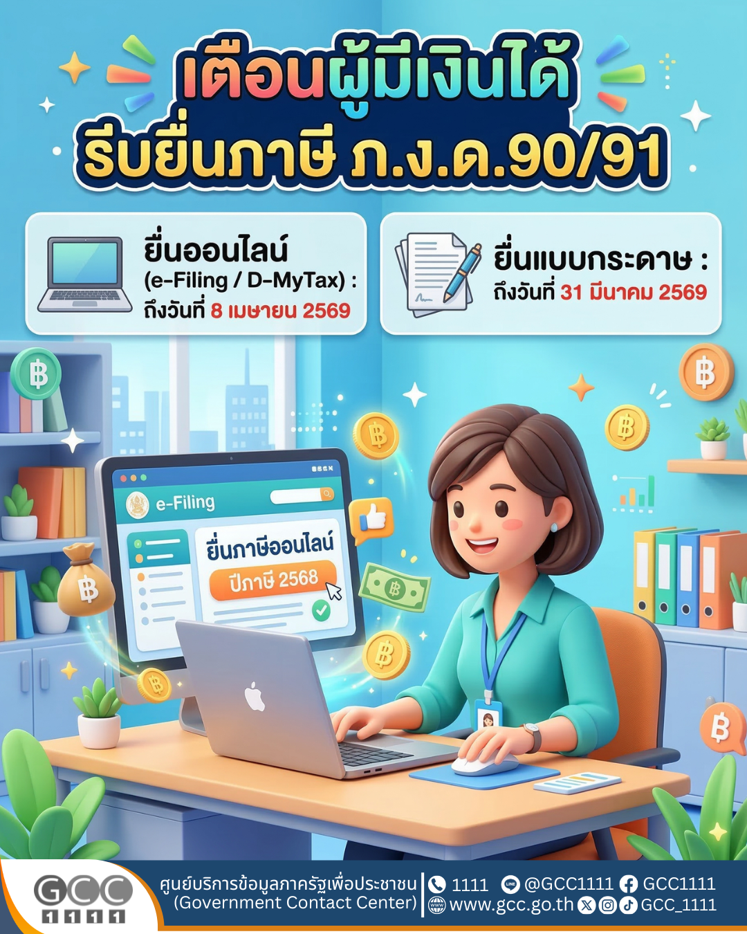 รัฐบาล เตือน ผู้มีเงินได้ รีบยื่นแบบภาษี ภ.ง.ด. 90/91 ยื่นแบบฯ ทางอิเล็กทรอนิกส์ได้ถึงวันที่ 8 เม.ย. และยื่นแบบฯ ด้วยกระดาษถึงวันที่ 31 มี.ค 69
