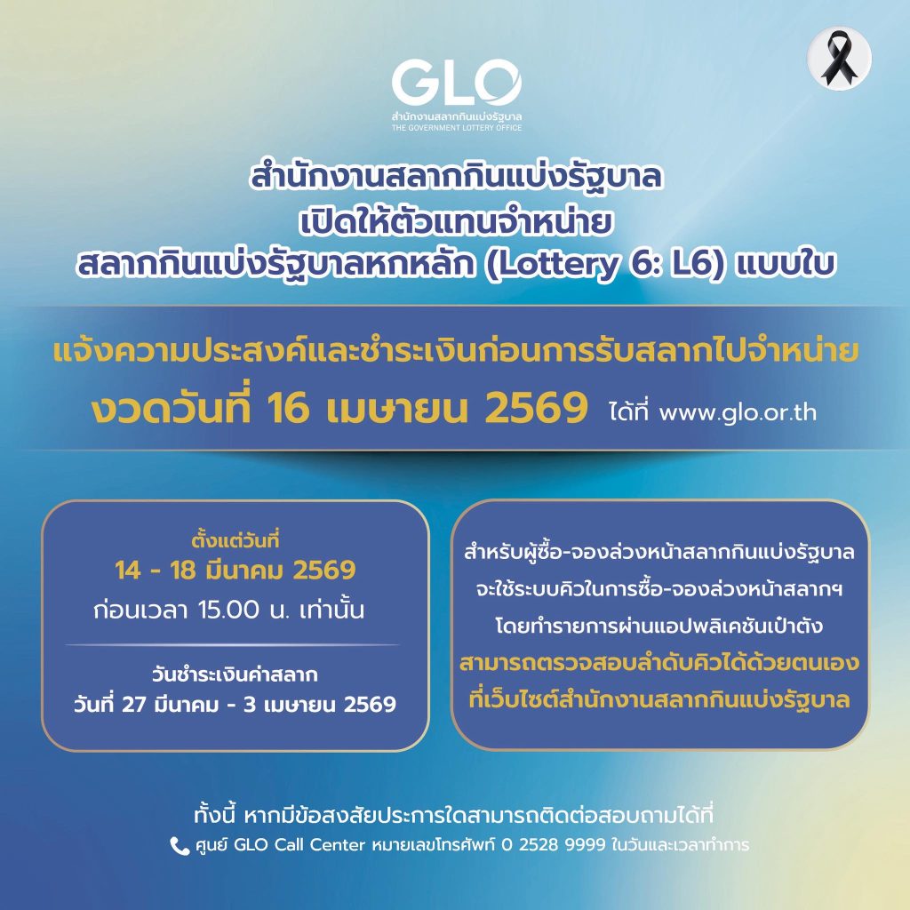 สำนักงานสลากกินแบ่งรัฐบาล เปิดให้ตัวแทนจำหน่ายสลากกินแบ่งรัฐบาลหกหลัก (Lottery 6: L6) แบบใบ สามารถแจ้งความประสงค์และชำระเงินก่อนการรับสลากไปจำหน่าย งวดวันที่ 16 เมษายน 2569 ได้ที่  www.glo.or.th หรือ https://services.glo.or.th/…/ind…/pages/req_sale_lottery