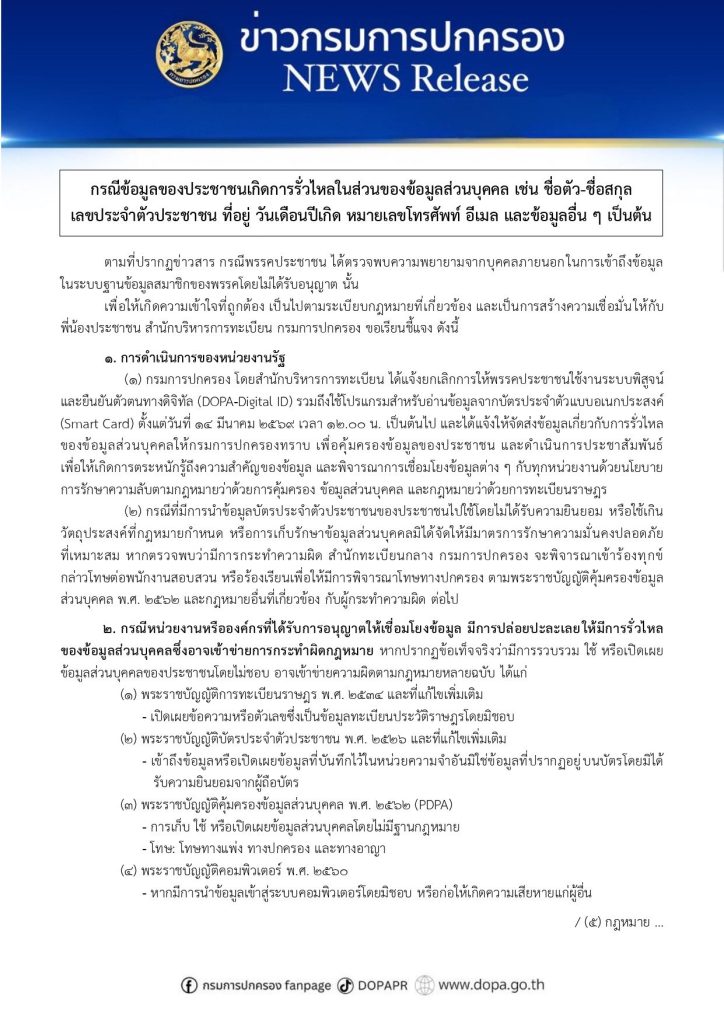 กรมการปกครอง ชี้แจงกรณีพรรคประชาชนตรวจพบความพยายามเข้าถึงฐานข้อมูลสมาชิกโดยมิชอบ
