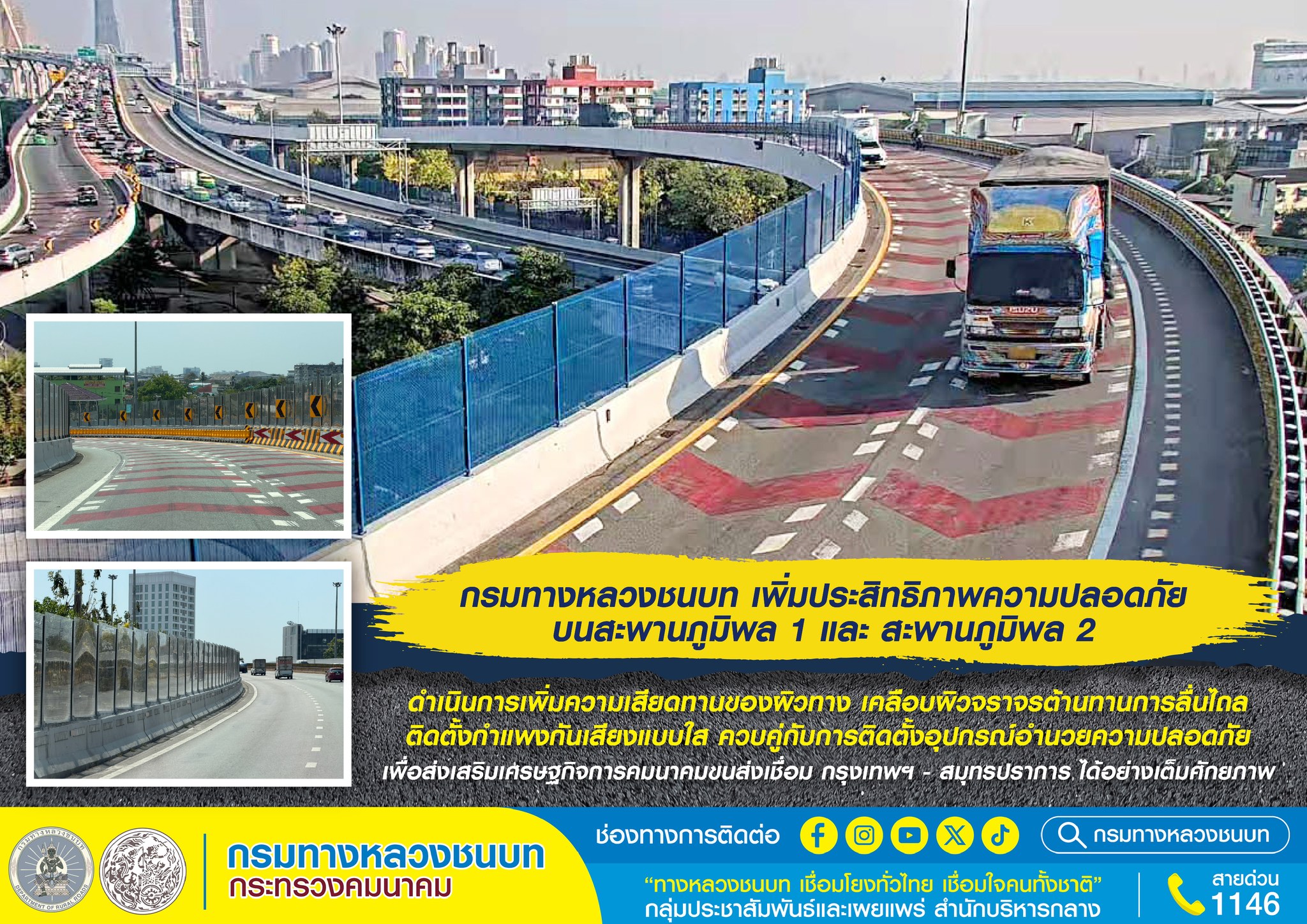 กรมทางหลวงชนบท เพิ่มประสิทธิภาพความปลอดภัยบนสะพานภูมิพล 1 และ 2 เพิ่มความเสียดทานของผิวทาง เคลือบผิวจราจรต้านทานการลื่นไถล ติดตั้งกำแพงกันเสียงแบบใส ควบคู่กับอุปกรณ์อำนวยความปลอดภัย ส่งเสริมเศรษฐกิจการคมนาคมขนส่งเชื่อมกรุงเทพฯ – สมุทรปราการ