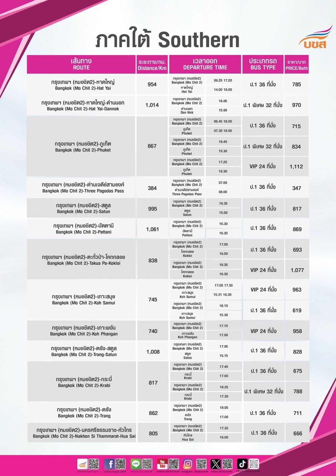 - เส้นทางภาคใต้ เปิดให้บริการ 18 เส้นทาง 60 เที่ยววิ่งต่อวัน เช่น กรุงเทพฯ (หมอชิต 2) – สตูล ระยะทาง 995 กม. ค่าโดยสาร 817 บาท เที่ยวไปออกจากหมอชิต 2 เวลา 16.35 น. เที่ยวกลับออกจากสตูล เวลา 15.00 น. และกรุงเทพฯ (สายใต้ใหม่) – สงขลา ระยะทาง 1,004 กม. ค่าโดยสาร 824 บาท เที่ยวไปออกจากกรุงเทพฯ (สายใต้ใหม่) เวลา 16.00 น. เที่ยวกลับออกจากสงขลา เวลา 15.00 น. เป็นต้น