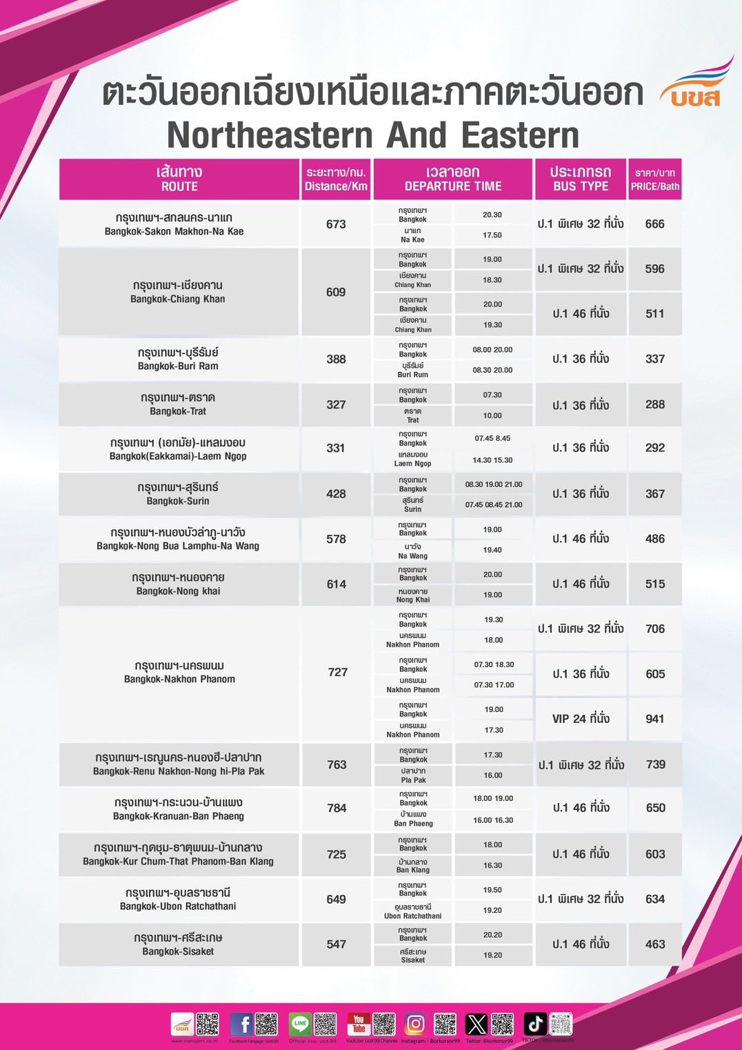 - เส้นทางภาคตะวันออกเฉียงเหนือและภาคตะวันออก เปิดให้บริการ 22 เส้นทาง 84 เที่ยววิ่งต่อวัน เช่น เส้นทางกรุงเทพฯ – ศรีสะเกษ ระยะทาง 547 กม. ค่าโดยสาร 463 บาท เที่ยวไปออกจากกรุงเทพฯ เวลา 20.20 น. เที่ยวกลับออกจากศรีสะเกษ เวลา 19.20 น. และกรุงเทพฯ – หนองคาย ระยะทาง 614 กม. ค่าโดยสาร 515 บาท เที่ยวไปออกจากกรุงเทพฯ เวลา 20.00 น. เที่ยวกลับออกจากหนองคาย เวลา 19.00 น.
