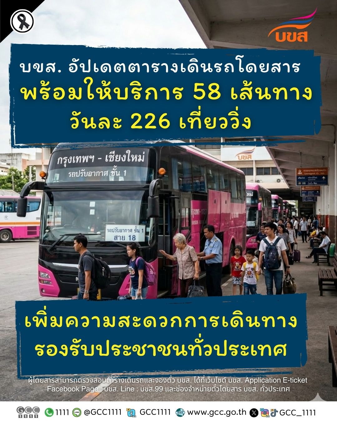จึงประชาสัมพันธ์ตารางเดินรถที่ บขส. เปิดให้บริการทั้งหมด 58 เส้นทาง 226 เที่ยววิ่งต่อวัน เพื่อรองรับความต้องการเดินทางของประชาชนให้สะดวกมากขึ้น
