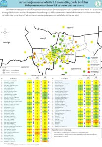 โดยพบปริมาณค่าฝุ่นละออง PM2.5 เกินเกณฑ์มาตรฐาน อยู่ในระดับ เริ่มมีผลกระทบต่อสุขภาพ 5 พื้นที่ (สีส้ม)