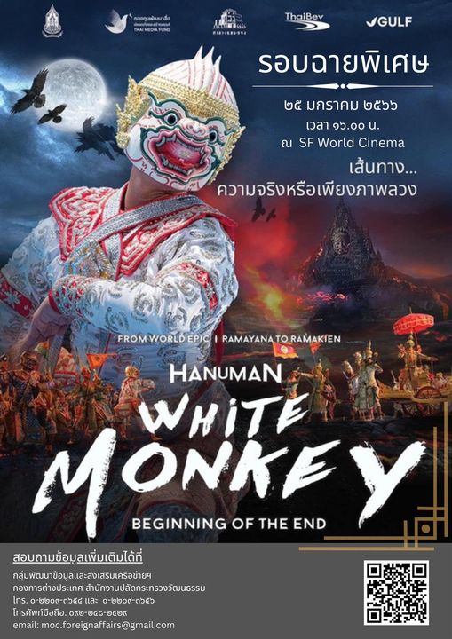 กระทรวงวัฒนธรรม ขอเชิญชวนประชาชนรับชม “โขนภาพยนตร์ หนุมาน WHITE MONKEY” ซึ่งถ่ายทอดเรื่องราวโขนรามเกียรติ์ ในรูปแบบภาพยนตร์ที่สนุกสนาน ตื่นเต้น และนำเสนอเทคนิคพิเศษที่เข้าถึงคนรุ่นใหม่ อีกทั้งเป็นการเผยแพร่ศิลปะการแสดงประจำชาติของไทยไปสู่สากล ในวันพุธที่ 25 มกราคม 2566 เวลา 16.00 น. ณ โรงภาพยนตร์เอส เอฟ เวิลด์ ซีเนม่า (โรงภาพยนตร์ที่ 9) ศูนย์การค้าเซ็นทรัลเวิลด์