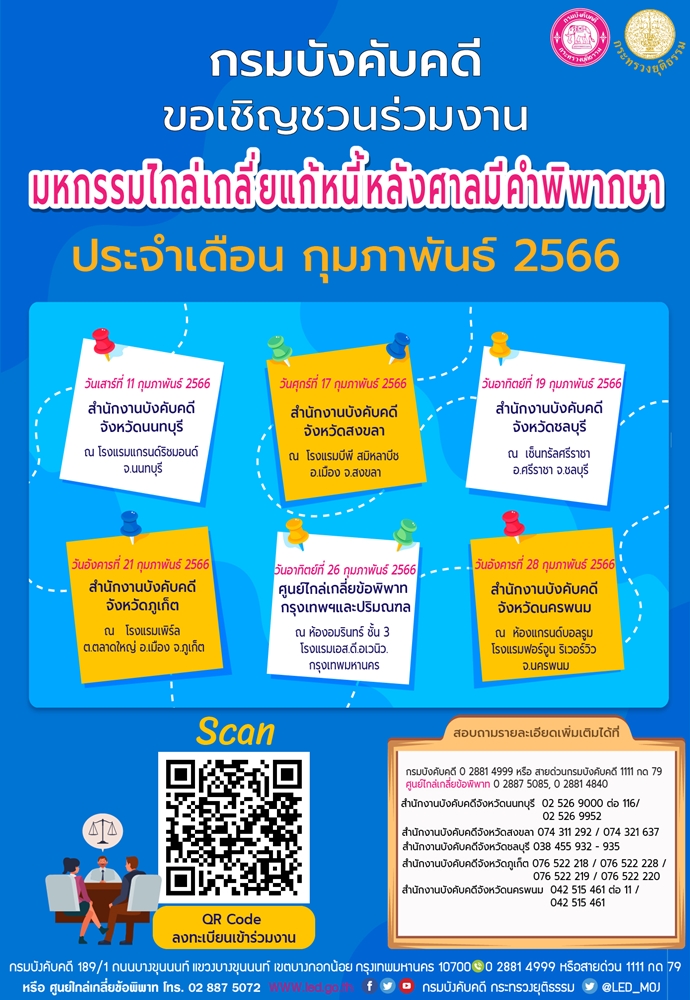 กรมบังคับคดี ชวนร่วมงานมหกรรมไกล่เกลี่ยแก้หนี้หลังศาลมีคำพพากษา ประจำเดือน กุมภาพันธ์ 2566