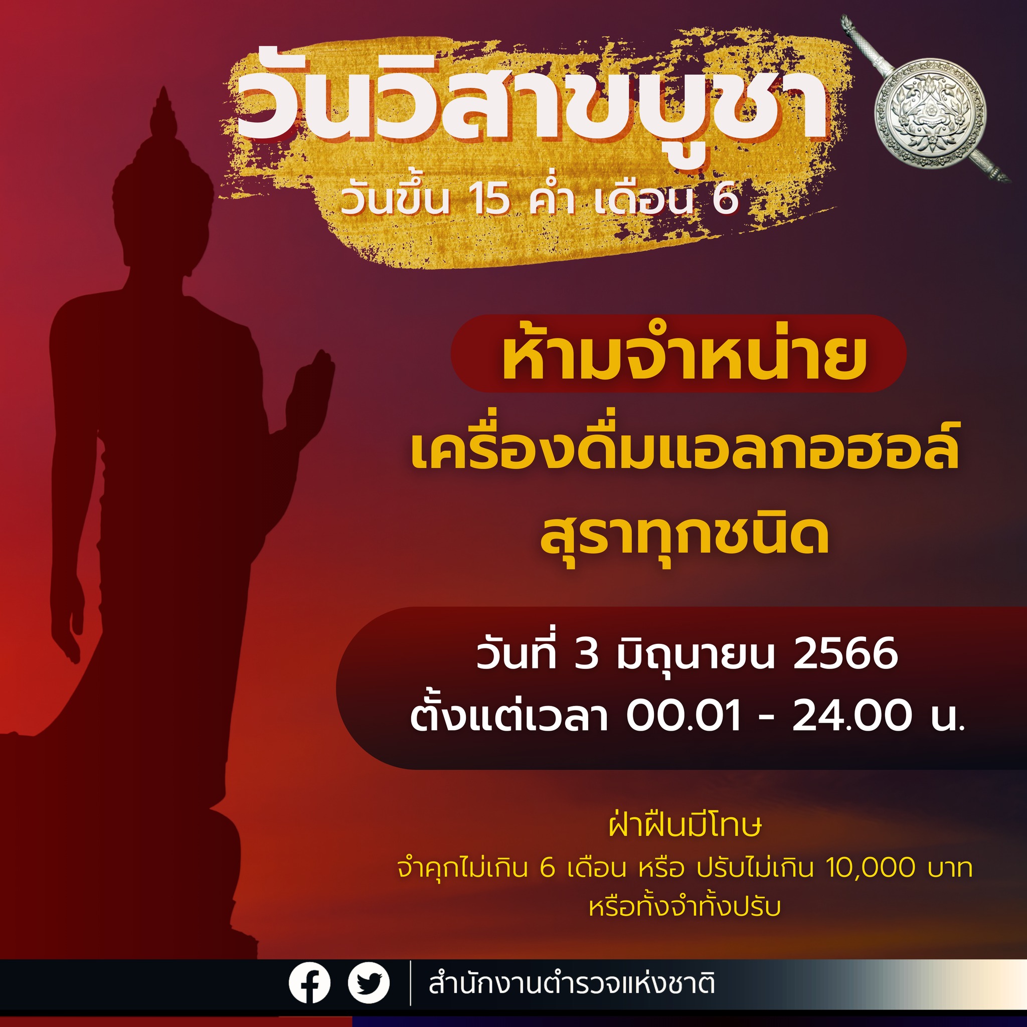 สำนักงานตำรวจแห่งชาติ เตือนห้ามขายเครื่องดื่มแอลกอฮอล์ในวันวิสาขบูชา 2566