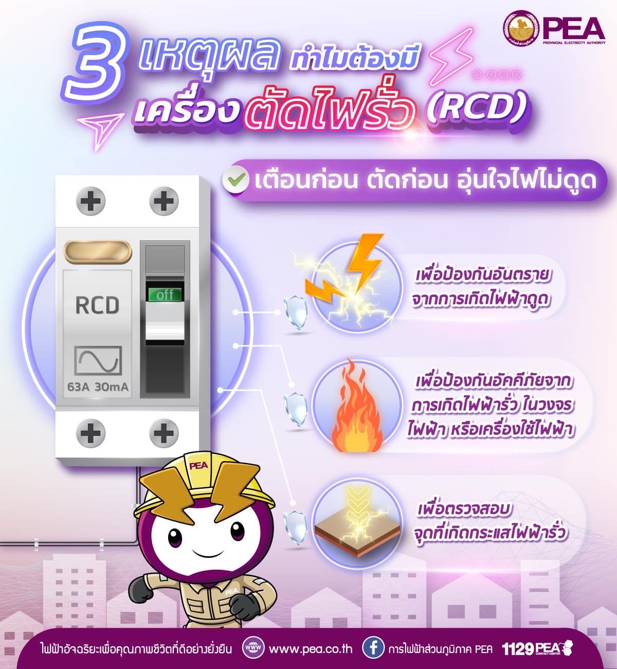 เครื่องใช้ไฟฟ้าคือสิ่งอำนวยความสะดวกในชีวิตประจำวันแต่อันตรายที่เกิดจากเครื่องใช้ไฟฟ้าสามารถทำให้ถึงแก่ชีวิต PEA แนะนำให้ติดตั้งเครื่องตัดไฟรั่ว (RCD = Residual Current Device คือเครื่องตัดไฟฟ้าอัตโนมัติที่จะตัดวงจรเมื่อกระแสไฟฟ้าไหลผ่านสายเฟสและสายนิวทรัลมีค่าไม่เท่ากัน) ประโยชน์ของเครื่องตัดไฟรั่วเพื่อป้องกันอันตรายที่อาจเกิดขึ้น ดังนี้