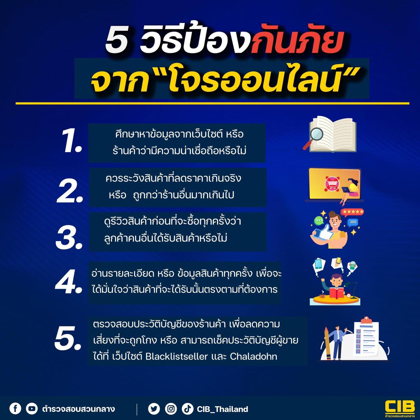 เพจตำรวจสอบสวนกลาง (CIB) จึงขอเตือน 5 วิธีป้องกันไม่ให้ตกเป็นเหยื่อจากการซื้อของออนไลน์