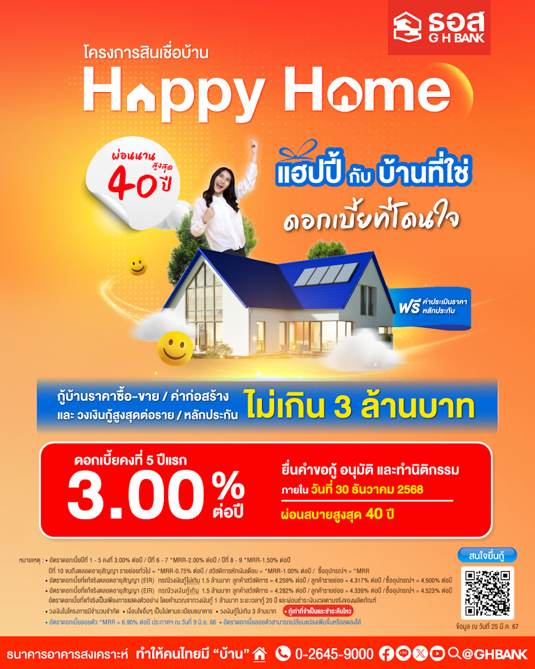 ธนาคารอาคารสงเคราะห์ จัดโครงการสินเชื่อบ้าน Happy Home สำหรับผู้ที่ต้องการซื้อบ้าน ห้องชุด (คอนโดมิเนียม) ปลูกสร้าง และเพื่อซื้ออุปกรณ์หรือสิ่งอำนวยความสะดวก ที่เกี่ยวเนื่องกับที่อยู่อาศัย ไม่เกิน 3 ล้านบาท สามารถยื่นกู้ อนุมัติ และทำนิติกรรม ภายในวันที่ 30 ธันวาคม 2568