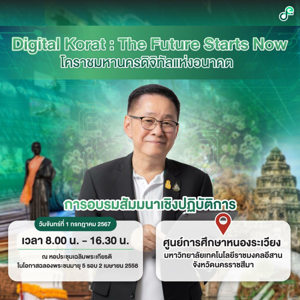 การอบรมสัมมนาเชิงปฏิบัติการ Digital Korat : The Future Starts Now โคราชมหานครดิจิทัลแห่งอนาคต วันที่ 1 กรกฎาคม 2567 เวลา 08.00 – 16.00 น. ณ หอประชุมเฉลิมพระเกียรติ ในโอกาสฉลองพระชนมายุ 5 รอบ 2 เมษายน 2558 ศูนย์การศึกษาหนองระเวียง มหาวิทยาลัยเทคโนโลยีราชมงคลอีสาน จังหวัดนครราชสีมา