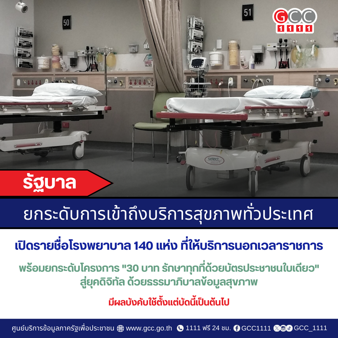 รัฐบาล ยกระดับการเข้าถึงบริการสุขภาพทั่วประเทศ มีผลบังคับใช้แล้ว 140 แห่ง โรงพยาบาลที่ให้บริการนอกเวลาราชการ พร้อมยกระดับโครงการ “30 บาท รักษาทุกที่ด้วยบัตรประชาชนใบเดียว” สู่ยุคดิจิทัล ด้วยธรรมาภิบาลข้อมูลสุขภาพ