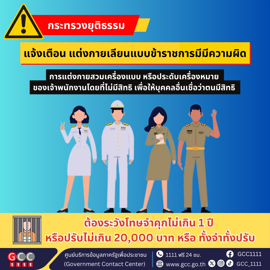 กระทรวงยุติธรรม แจ้งเตือนแต่งกายเลียนแบบข้าราชการมีมีความผิด โดยการแต่งกายสวมเครื่องแบบ หรือประดับเครื่องหมาย ของเจ้าพนักงานโดยที่ไม่มีสิทธิ เพื่อให้บุคคลอื่นเชื่อว่าตนมีสิทธิ ต้องระวังโทษจำคุกไม่เกิน 1 ปี หรือปรับไม่เกิน 20,000 บาท หรือทั้งจำทั้งปรับ
