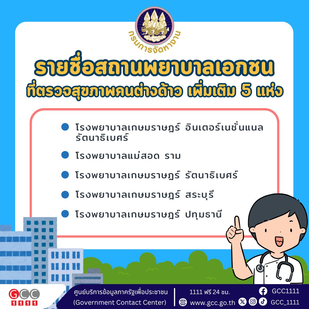 เนื่องจากมีสถานพยาบาลเอกชนที่ผ่านการตรวจพิจารณาหลักเกณฑ์ของสถานพยาบาลเอกชนที่จะตรวจสุขภาพคนต่างด้าวซึ่งจะขอรับใบอนุญาตทำงานตามมติคณะรัฐฐนตรีเมื่อวันที่ 24 กันยายน 2567 ตามที่กรมการจัดหางานกำหนด และมีการเชื่อมโยงข้อมูลผลการตรวจสุขภาพกับระบบของกรมการจัดหางานเพิ่มเติม ดังนั้น เพื่อให้คนต่างด้าว นายจ้าง ตลอดจนผู้ที่เกี่ยวข้องได้รับทราบข้อมูล รวมทั้งสามารถพิจารณาเลือกสถานพยาบาลเอกชนในการตรวจสุขภาพ กรมการจัดหางานจึงขอประกาศรายชื่อสถานพยาบาลเอกชนที่ตรวจสุขภาพคนต่างด้าวซึ่งจะขอรับใบอนุญาตทำงทำงานตามมติคณะรัฐมนตรีเมื่อวันที่ 24 กันยายน 2567 เพิ่มเติม จำนวน 5 แห่ง ดังนี้