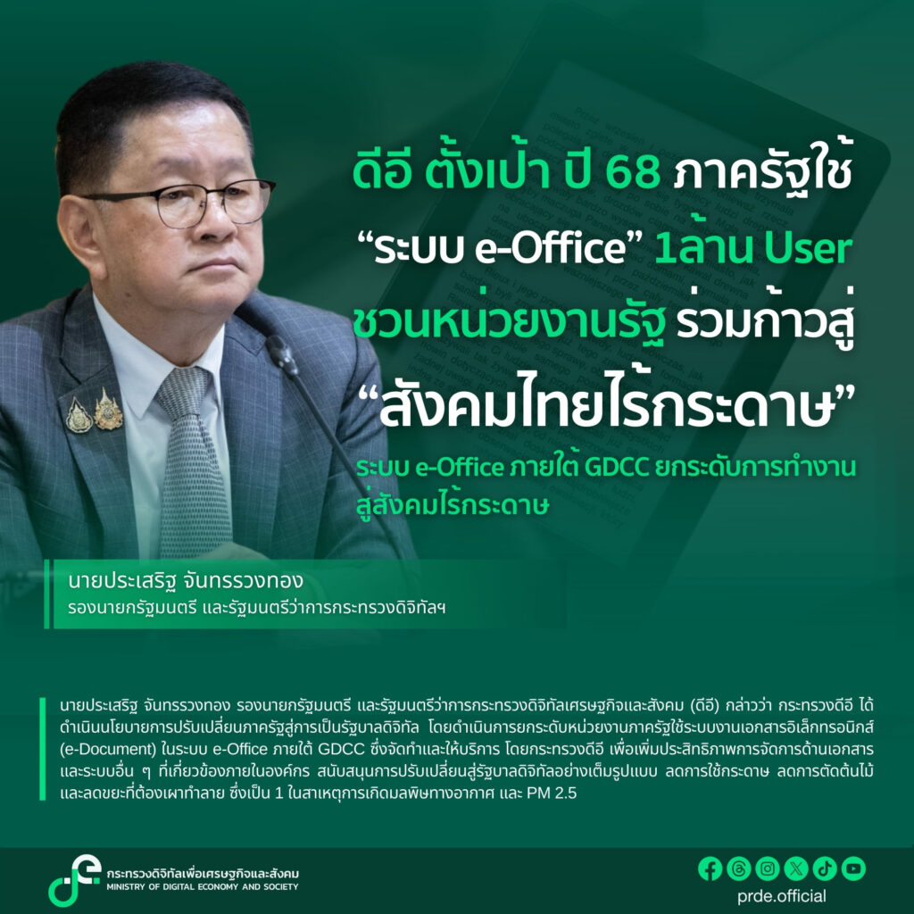 ดีอี ตั้งเป้า ปี 68 ภาครัฐใช้ ระบบ e-Office 1 ล้าน User ชวนหน่วยงานรัฐ ร่วมก้าวสู่ สังคมไทยไร้กระดาษ