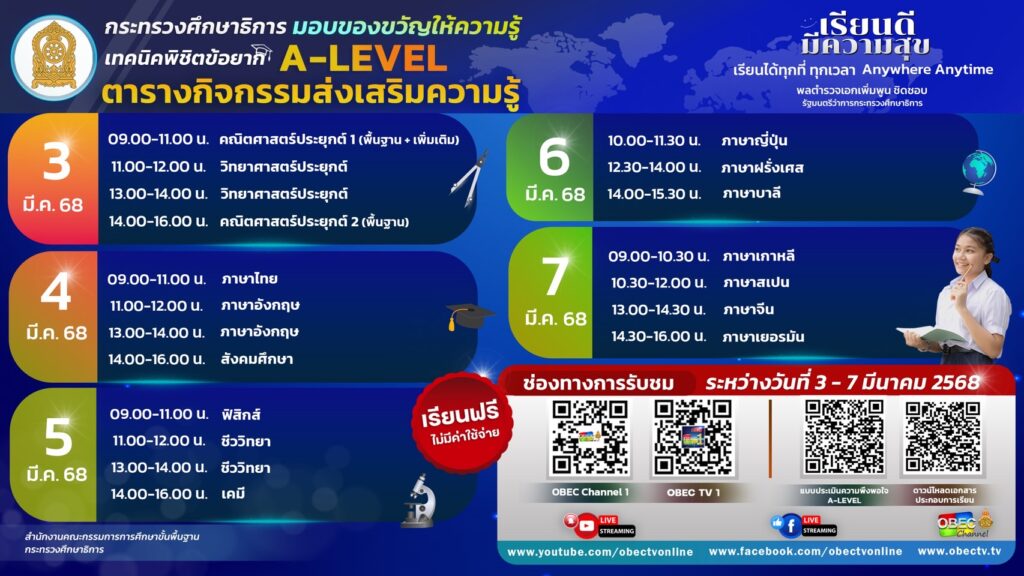 กระทรวงศึกษาธิการ มอบของขวัญให้ความรู้ เทคนิคพิชิตข้อยาก กล่องความรู้สู่ความสุข A-Level จัดตารางกิจกรรมส่งเสริมความรู้แก่นักเรียน 3-7 มีนาคม 2568 เรียนได้ทุกที่ทุกเวลา