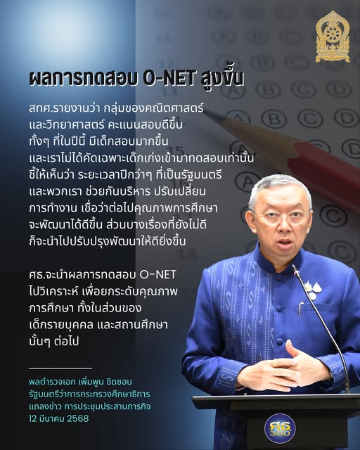 พล.ต.อ.เพิ่มพูน ชิดชอบ รมว.ศึกษาธิการ เปิดเผยภายหลังการประชุมผู้บริหารองค์กรหลักของกระทรวงศึกษาธิการ (ศธ.) ว่า ที่ประชุมได้มีการรายงานผลการทดสอบทางการศึกษาระดับชาติขั้นพื้นฐาน (โอเน็ต) ซึ่งสถาบันทดสอบทางการศึกษาแห่งชาติ (สทศ.) ได้ประกาศผลคะแนนสอบของนักเรียนที่เข้าสอบในระดับชั้นประถมศึกษาปีที่ 6 มัธยมศึกษาปีที่ 3 ประจำปีการศึกษา 2567 พบว่า คะแนนทดสอบในวิชาคณิตศาสตร์และวิทยาศาสตร์ปีนี้มีคะแนนเพิ่มสูงขึ้นในโรงเรียนทุกสังกัด และดีกว่าทุกปี รวมทั้งมีคะแนนสูงกว่าปีที่ผ่านมาด้วย ดังนั้นตนจึงขอฝากให้ผู้บริหารโรงเรียนได้ร่วมกันสร้างวัฒนธรรมขององค์กรและให้คุณค่าการประเมินผลทดสอบโอเน็ต เพื่อวัดระดับการศึกษาของนักเรียน และนำผลมายกระดับคุณภาพสถานศึกษาด้วย
