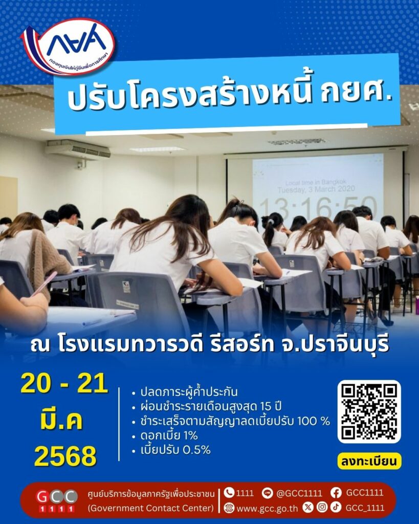 กยศ. ขอเชิญผู้กู้ยืมเข้าร่วมงานปรับโครงสร้างหนี้ จ.ปราจีนบุรี ระหว่างวันที่ 20 – 21 มีนาคม 2568