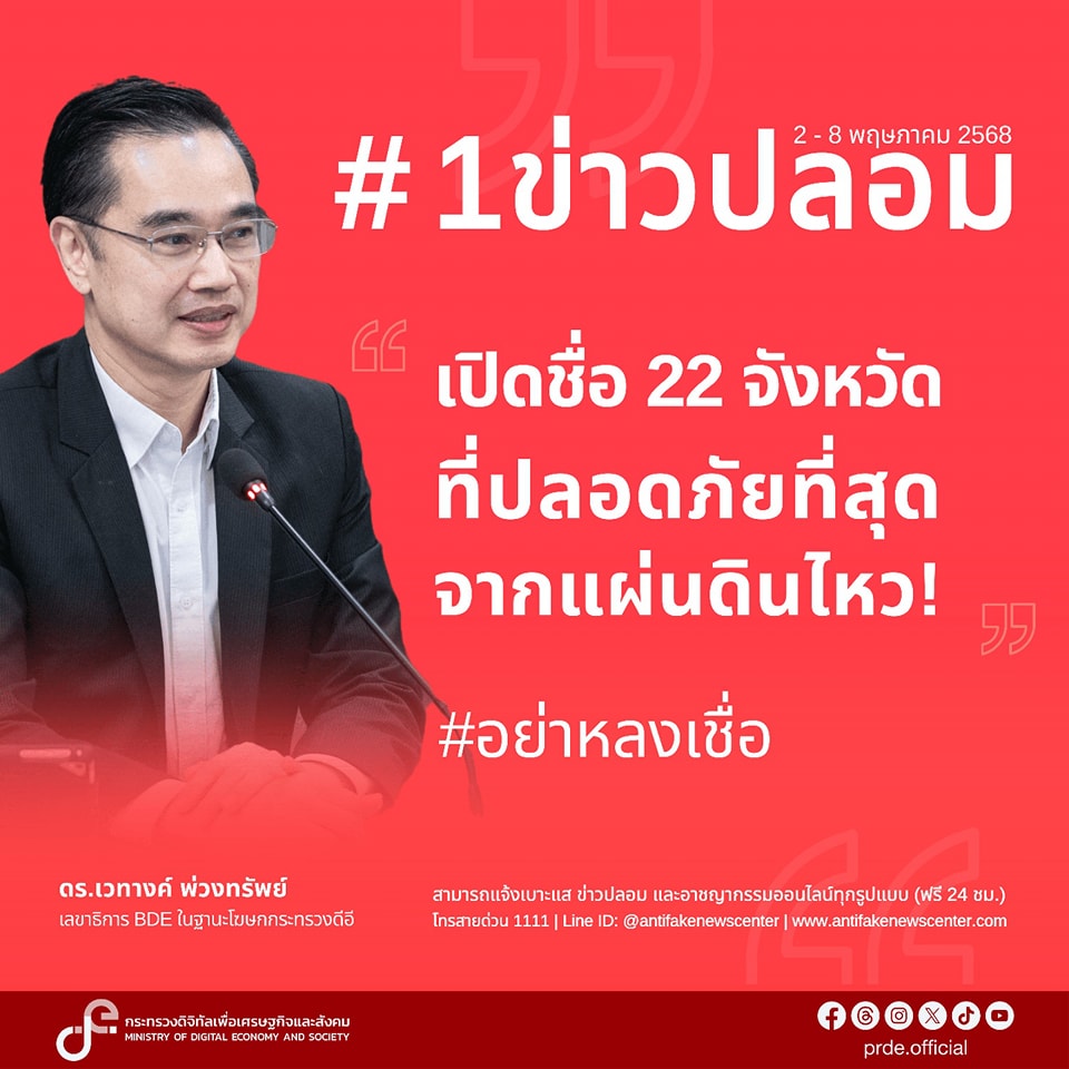 กระทรวงดิจิทัลเพื่อเศรษฐกิจและสังคม (ดีอี) ตรวจพบข่าวปลอมรายสัปดาห์ ที่ประชาชนให้ความสนใจสูงสุดอันดับที่ 1 เรื่อง “เปิดรายชื่อ 22 จังหวัด ที่ปลอดภัยที่สุดจากแผ่นดินไหว” รองลงมาคือเรื่อง “เปิดระดมทุนช่วยเหลือทหารบริเวณชายแดนไทย-กัมพูชา” โดยขอให้ประชาชน อย่าหลงเชื่อข่าวปลอม เลือกเชื่อ เลือกแชร์ ข้อมูลที่เป็นประโยชน์ อาจทำให้เกิดความวิตกกังวล สับสน และเข้าใจผิดในสังคม
