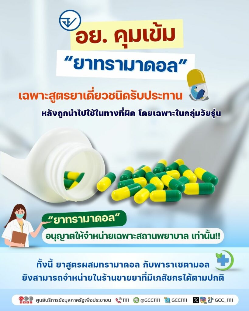 อย. ยกระดับมาตรการควบคุมการใช้ “ยาทรามาดอล” เฉพาะสูตรยาเดี่ยวชนิดรับประทาน ซึ่งพบปัญหาการนำไปใช้ในทางที่ผิดโดยเฉพาะในกลุ่มวัยรุ่น ขณะที่ยาสูตรผสมทรามาดอลกับพาราเซตามอล ยังคงสามารถจำหน่ายได้ในร้านขายยาที่มีเภสัชกรควบคุม