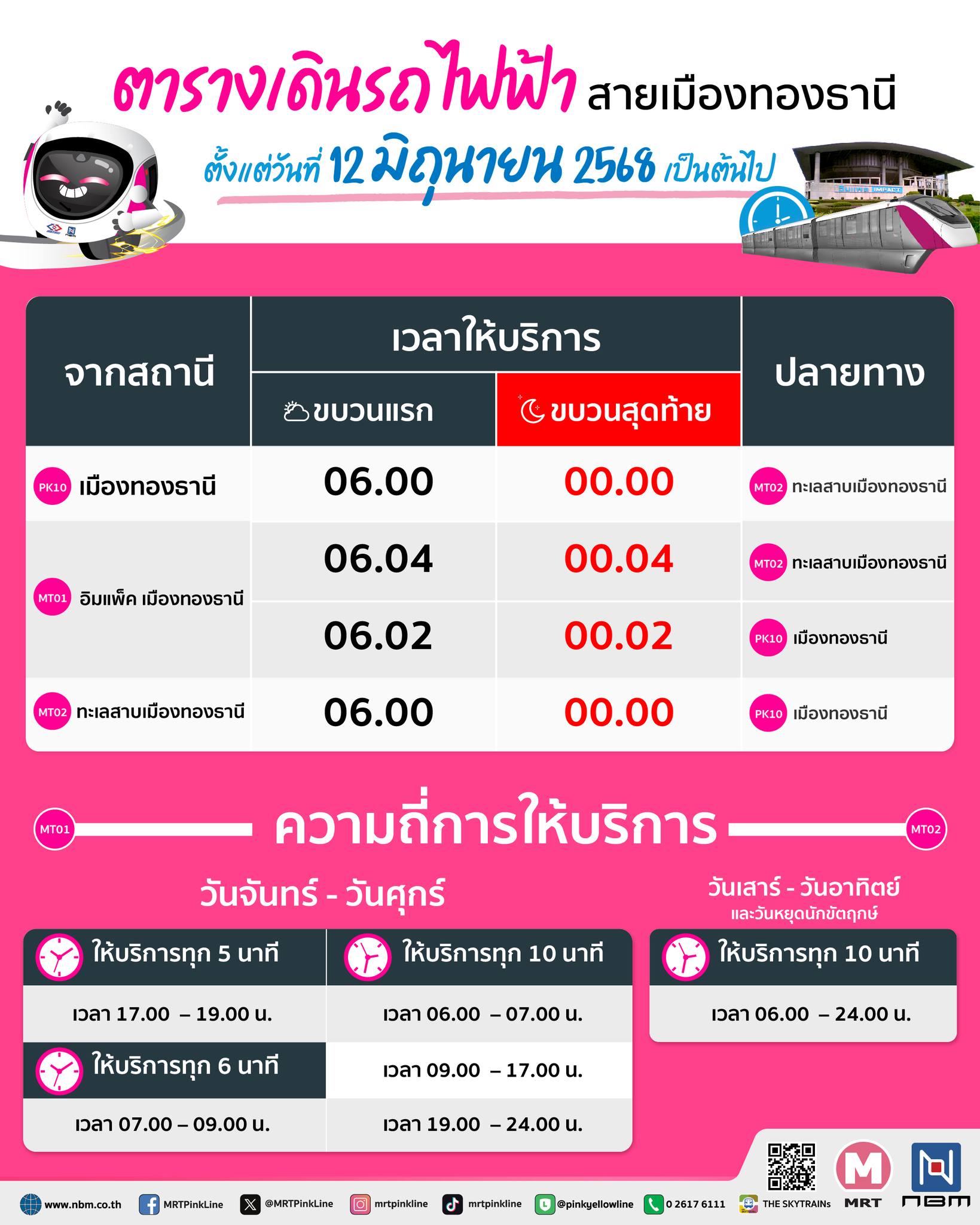 รถไฟฟ้ามหานคร สายสีชมพู แจ้งตารางเดินรถไฟฟ้า สายเมืองทองธานี ตั้งแต่วันที่ 12 มิถุนายน 2568 เป็นต้นไป เปิดให้บริการทุกวัน เวลา 06.00 – 24.00 น.