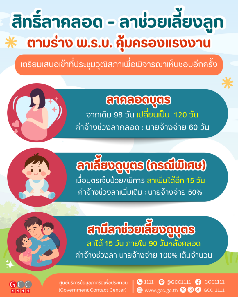 - ลูกจ้างหญิงมีสิทธิลาคลอด 120 วัน (จากเดิม 98 วัน)