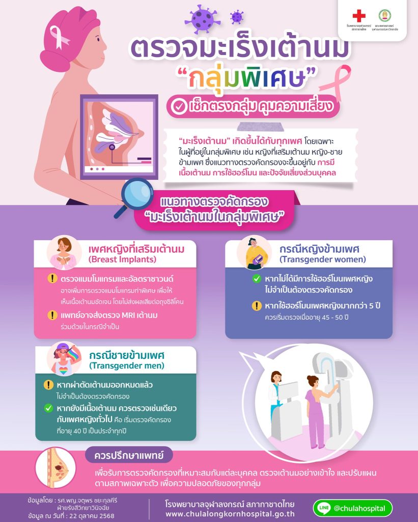 โรงพยาบาลจุฬาลงกรณ์ สภากาชาดไทย แนะนำตรวจมะเร็งเต้านม กลุ่มพิเศษ เช็กตรงกลุ่ม คุมความเสี่ยง โดยมะเร็งเต้านม สามารถเกิดขึ้นได้ในคนทุกเพศที่มีเนื้อเต้านม ในผู้ป่วยกลุ่มพิเศษ เช่น หญิงที่เสริมเต้านม หญิงชายข้ามเพศ แนวทางตรวจคัดกรองขึ้นอยู่กับการมีเนื้อเต้านม การใช้ฮอร์โมน และปัจจัยเสี่ยงส่วนบุคคล
