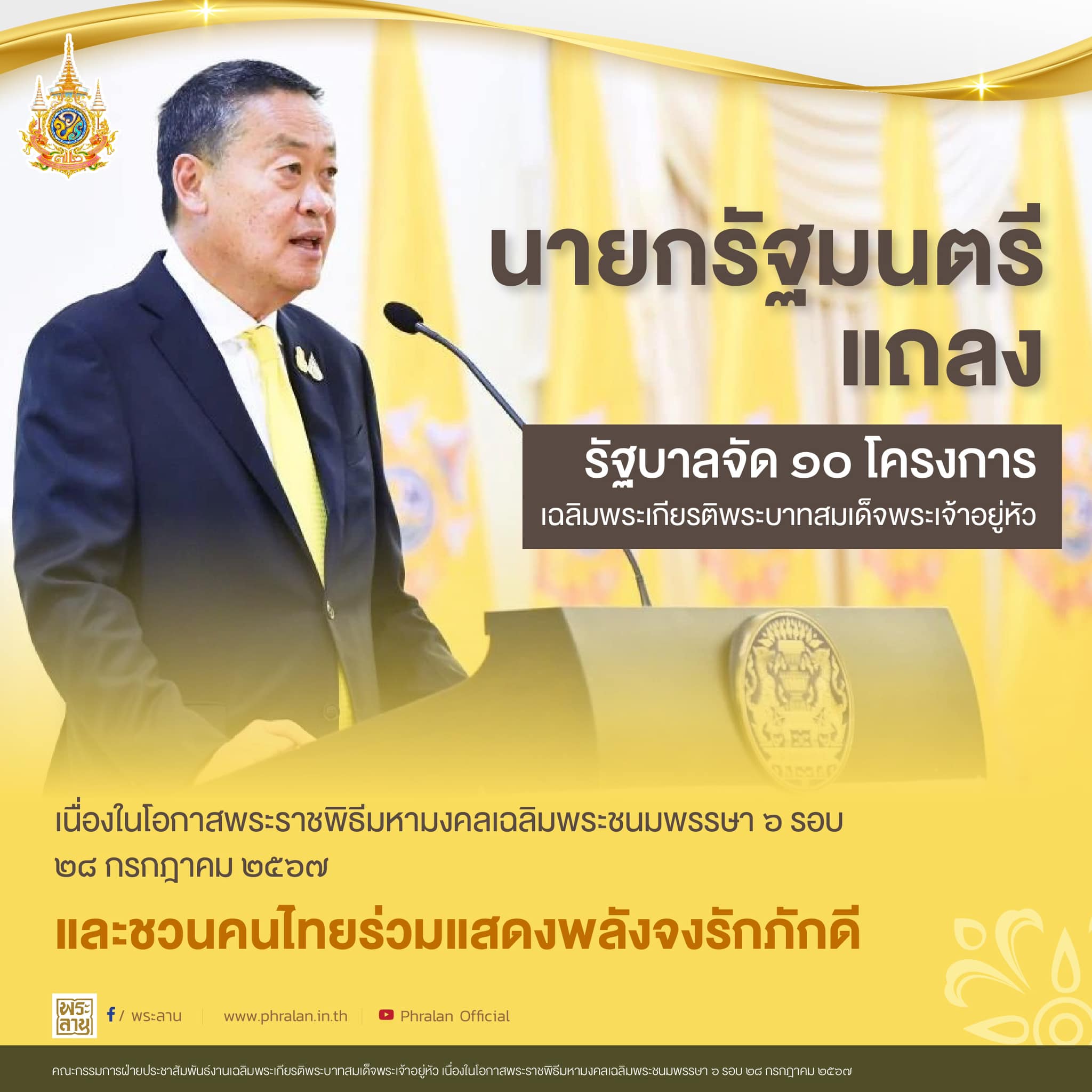 รัฐบาล แถลงเปิด 10 โครงการเฉลิมพระเกียรติพระบาทสมเด็จพระเจ้าอยู่หัว เนื่องในโอกาสพระราชพิธีมหามงคลเฉลิมพระชนมพรรษา 6 รอบ 28 กรกฎาคม 2567