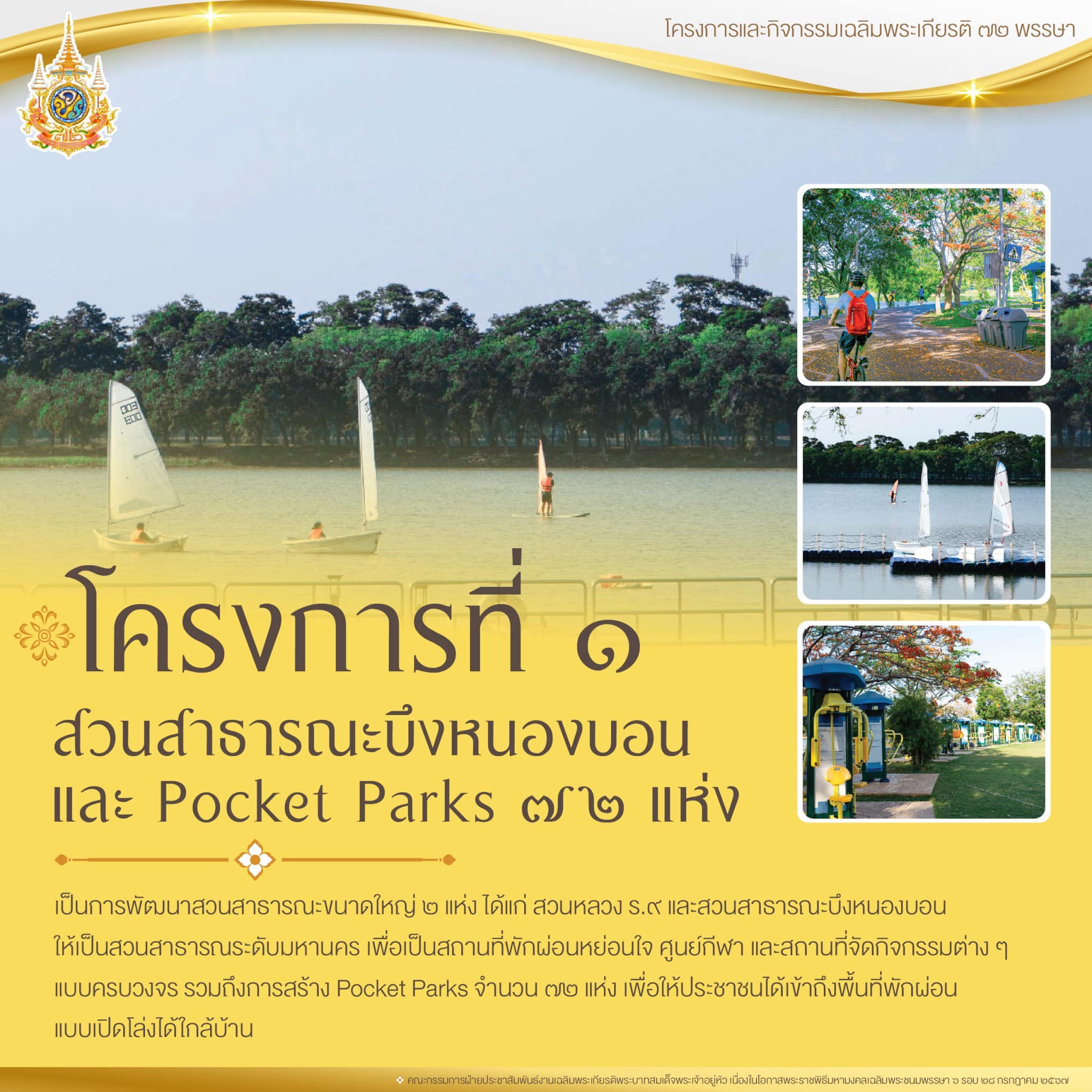 โครงการที่ 1 โครงการยกระดับสวนสาธารณะบึงหนองบอน และ Pocket Parks 72 แห่ง เฉลิมพระเกียรติพระบาทสมเด็จพระเจ้าอยู่หัว เนื่องในโอกาสพระราชพิธีมหามงคลเฉลิมพระชนมพรรษา 6 รอบ 28 กรกฎาคม 2567 เพื่อเป็นการเพิ่มพื้นที่สีเขียว รวมทั้งเป็นสถานที่ท่องเที่ยวเชิงธรรมชาติแบบครบวงจร ให้กับประชาชนในพื้นที่กรุงเทพมหานคร และปริมณฑล โดยจะดำเนินการพัฒนาสวนสาธารณะขนาดใหญ่ 2 แห่ง ได้แก่ สวนหลวง ร.9 ซึ่งมีพื้นที่ประมาณ 500 ไร่ และสวนสาธารณะบึงหนองบอน ให้เป็นสวนสาธารณะระดับมหานครที่มีพื้นที่รวมกันกว่า 1,144 ไร่ ซึ่งจะจัดให้เป็นสถานที่เล่นกีฬา ออกกำลังกาย พักผ่อนหย่อนใจ และทำกิจกรรมต่าง ๆ แบบครบวงจร เพรียบพร้อมด้วยอาคารสถานที่ และสิ่งอำนวยความสะดวก ตลอดจนภูมิทัศน์ที่สวยงาม นอกจากนี้ยังเป็นการฟื้นฟูระบบนิเวศและความหลากหลายทางชีวภาพเพื่อให้เป็นแหล่งศึกษาธรรมชาติ และใช้ในการบริหารจัดการน้ำของเมืองแบบครบวงจร ทั้งนี้ รัฐบาลจะขอพระราชทานชื่อสวนสาธารณะแห่งนี้ ว่า “สวนหลวง ร.10” ต่อไป รวมถึงการสร้างพื้นที่สาธารณะเปิดโล่ง (outdoor public space) หรือ Pocket Parks จำนวน 72 แห่ง ในเขตพื้นที่กรุงเทพมหานคร เพื่อให้ประชาชนได้เข้าถึงพื้นที่พักผ่อนแบบเปิดโล่งได้ใกล้บ้าน ซึ่งกำหนดเป้าหมายการเข้าถึงของประชาชนภายในระยะ 800 เมตร หรือระยะการเดิน 10 – 15 นาที