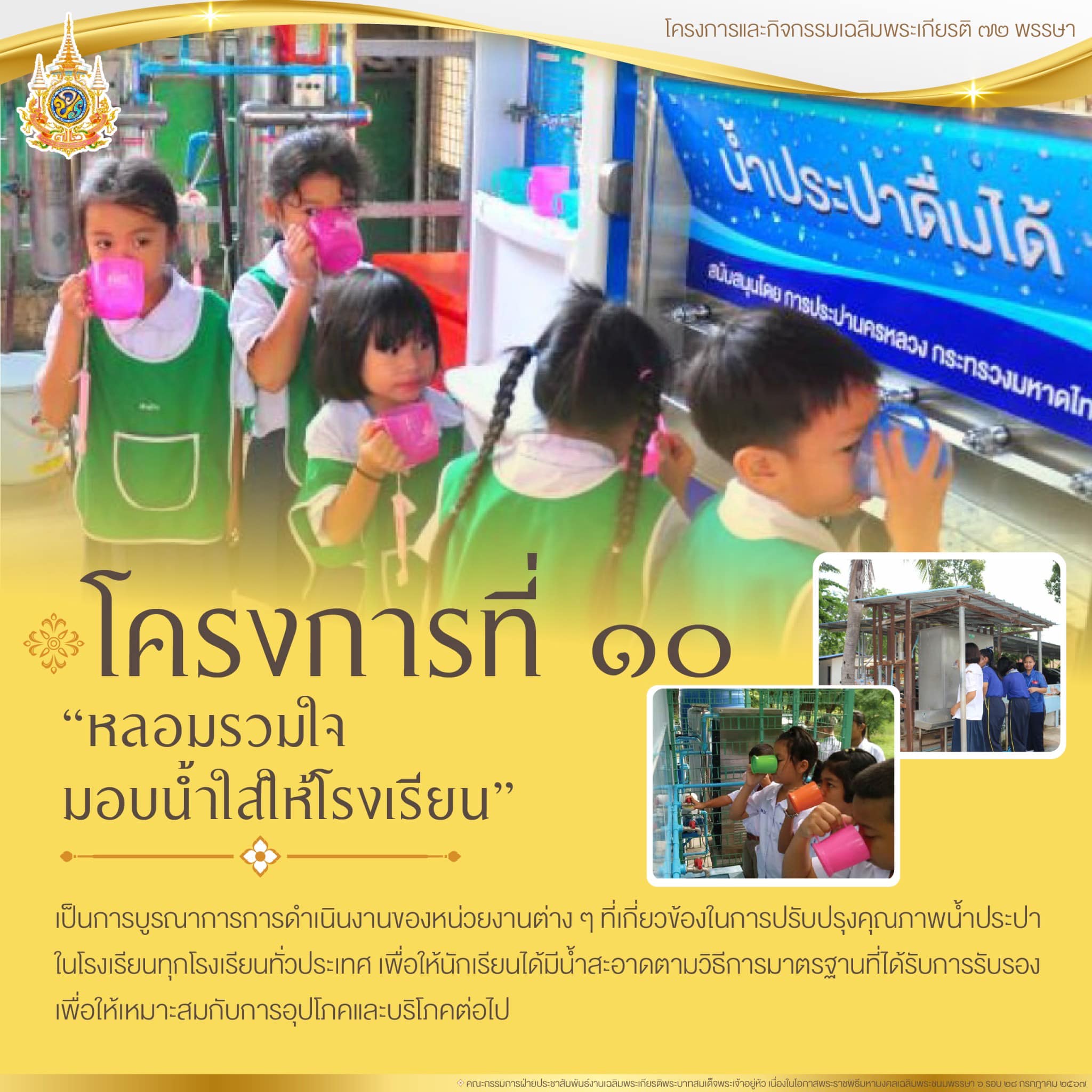 โครงการที่ 10 โครงการ “หลอมรวมใจ มอบน้ำใสสะอาดให้โรงเรียน” เฉลิมพระเกียรติพระบาทสมเด็จพระเจ้าอยู่หัว เนื่องในโอกาสพระราชพิธีมหามงคลเฉลิมพระชนมพรรษา 6 รอบ 28 กรกฎาคม 2567 เพื่อให้เด็กนักเรียนได้มีน้ำสะอาดในการอุปโภคและบริโภค รวมถึงเพื่อเป็นการส่งเสริมสุขภาวะที่ดี รัฐบาลจึงได้มอบหมายให้กระทรวงมหาดไทยเป็นหน่วยงานหลักในการดำเนินงาน โดยเป็นการบูรณาการการดำเนินงานร่วมกันของหน่วยงานต่าง ๆ ที่เกี่ยวข้องในการปรับปรุงคุณภาพน้ำประปาในโรงเรียนทุกแห่งทั่วประเทศ ซึ่งจะต้องมีการตรวจสอบและวิเคราะห์คุณภาพน้ำทั้งด้านกายภาพ เคมี และแบคทีเรีย ตามวิธีการมาตรฐานที่ได้รับการรับรองเพื่อให้เหมาะกับการอุปโภคและบริโภคต่อไป