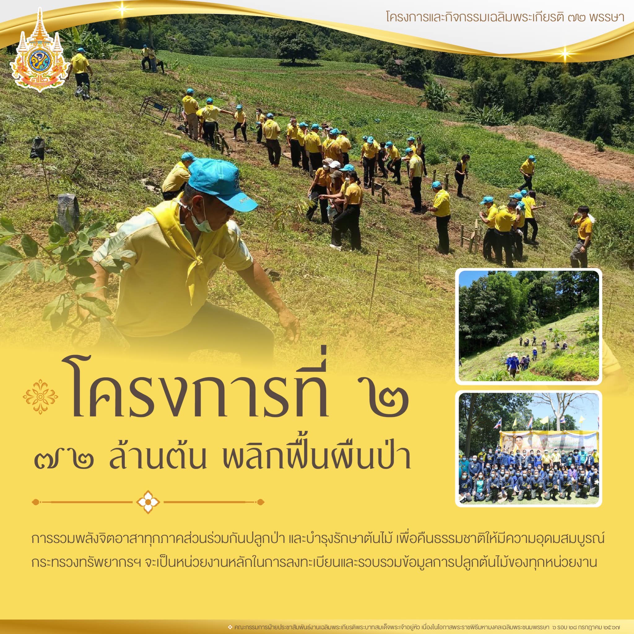 โครงการที่ 2 โครงการ 72 ล้านต้น พลิกฟื้นผืนป่า เฉลิมพระเกียรติพระบาทสมเด็จพระเจ้าอยู่หัว เนื่องในโอกาสพระราชพิธีมหามงคลเฉลิมพระชนมพรรษา 6 รอบ 28 กรกฎาคม 2567 เพื่อเป็นการฟื้นฟูและรักษาสภาพป่าต้นน้ำ รวมถึงการคืนสภาพโครงสร้างของระบบนิเวศให้กับผืนป่าทั่วประเทศ รัฐบาลจึงจัดทำโครงการเพื่อรวมพลังจิตอาสาของทุกภาคส่วนในการร่วมกันปลูกป่า และบำรุงรักษาต้นไม้ เพื่อคืนธรรมชาติให้มีความอุดมสมบูรณ์ คืนอากาศสะอาดให้กับประชาชน โดยตั้งเป้าหมายในการปลูกป่าทั่วประเทศ จำนวนทั้งสิ้น 72 ล้านต้น ทั้งนี้ ได้มอบให้กระทรวงทรัพยากรธรรมชาติและสิ่งแวดล้อมเป็นหน่วยงานหลักในการรับลงทะเบียน จัดหาพันธุ์กล้าไม้ และรวบรวมข้อมูลการปลูกต้นไม้ของทุกหน่วยงาน องค์กร หรือกลุ่มบุคคล เพื่อใช้ประกอบในการดูแลรักษาต่อไป