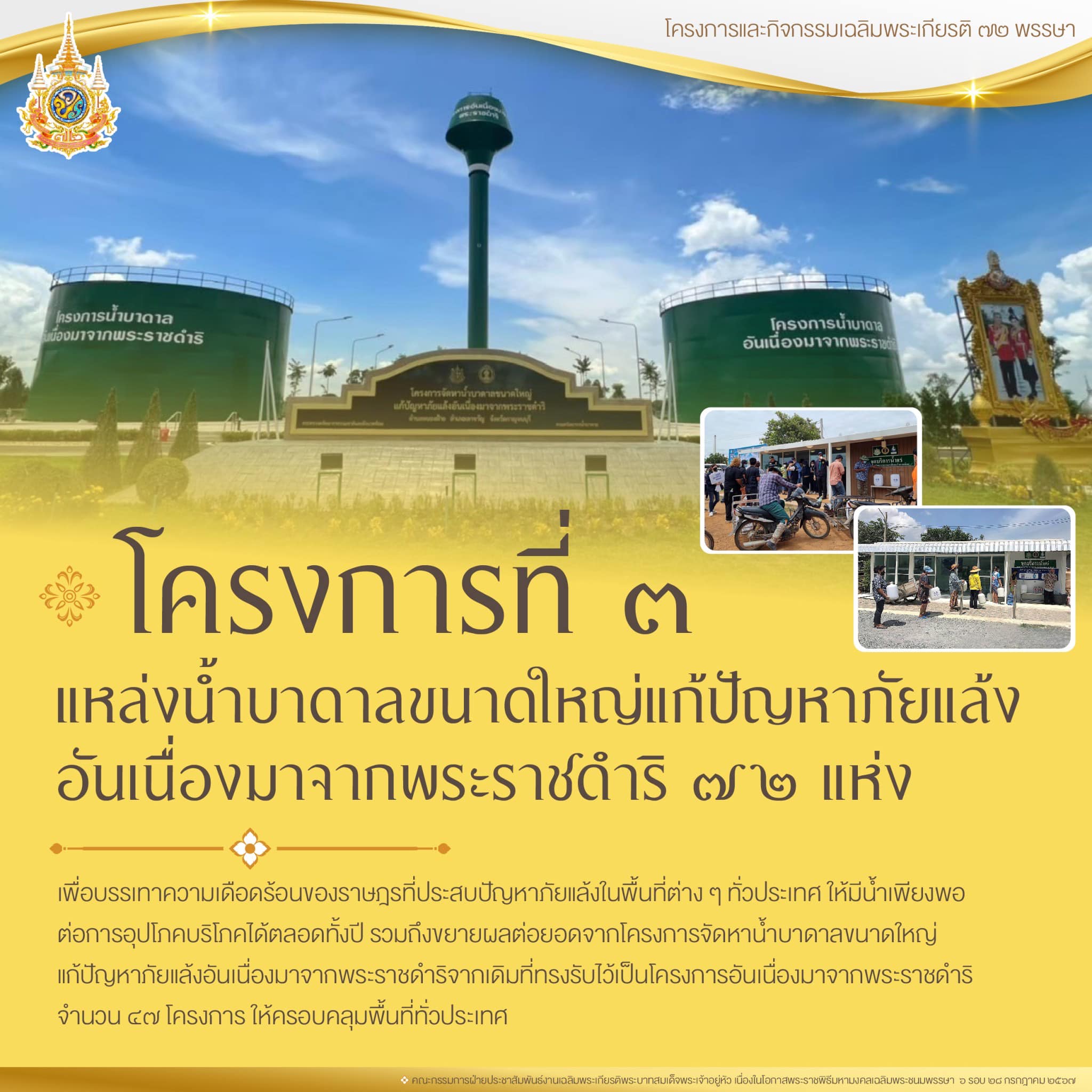 โครงการที่ 3 โครงการแหล่งน้ำบาดาลขนาดใหญ่แก้ปัญหาภัยแล้งอันเนื่องมาจากพระราชดำริ 72 แห่ง เฉลิมพระเกียรติพระบาทสมเด็จพระเจ้าอยู่หัว เนื่องในโอกาสพระราชพิธีมหามงคลเฉลิมพระชนมพรรษา 6 รอบ 28 กรกฎาคม 2567 เพื่อบรรเทาความเดือดร้อนของราษฎรที่ประสบปัญหาภัยแล้งในพื้นที่ต่าง ๆ ทั่วประเทศ ให้มีน้ำเพียงพอต่อการอุปโภคบริโภคได้ตลอดทั้งปี รวมถึงเพื่อเป็นการขยายผลต่อยอดจากโครงการจัดหาน้ำบาดาลขนาดใหญ่แก้ปัญหาภัยแล้งอันเนื่องมาจากพระราชดำริ จากเดิมที่ทรงรับไว้เป็นโครงการอันเนื่องมาจากพระราชดำริ จำนวน 47 โครงการ ครอบคลุมพื้นที่ 25 จังหวัด รัฐบาลโดยกระทรวงทรัพยากรธรรมชาติและสิ่งแวดล้อม จึงขยายขอบเขตการดำเนินโครงการเพิ่มเติม จำนวน 25 แห่ง รวมเป็น 72 แห่ง เพื่อให้ครอบคลุมพื้นที่ทั่วประเทศ โดยจะพิจารณาพื้นที่ที่ประสบปัญหาภัยแล้งและขาดแคลนน้ำ ไม่มีศักยภาพในการเจาะบ่อน้ำบาดาล จำเป็นต้องทำการเจาะบ่อน้ำบาดาลขนาดใหญ่ พร้อมกับก่อสร้างระบบประปาบาดาลในพื้นที่ที่มีความเหมาะสมเพื่อช่วยเหลือราษฎรไม่ให้เดือดร้อน