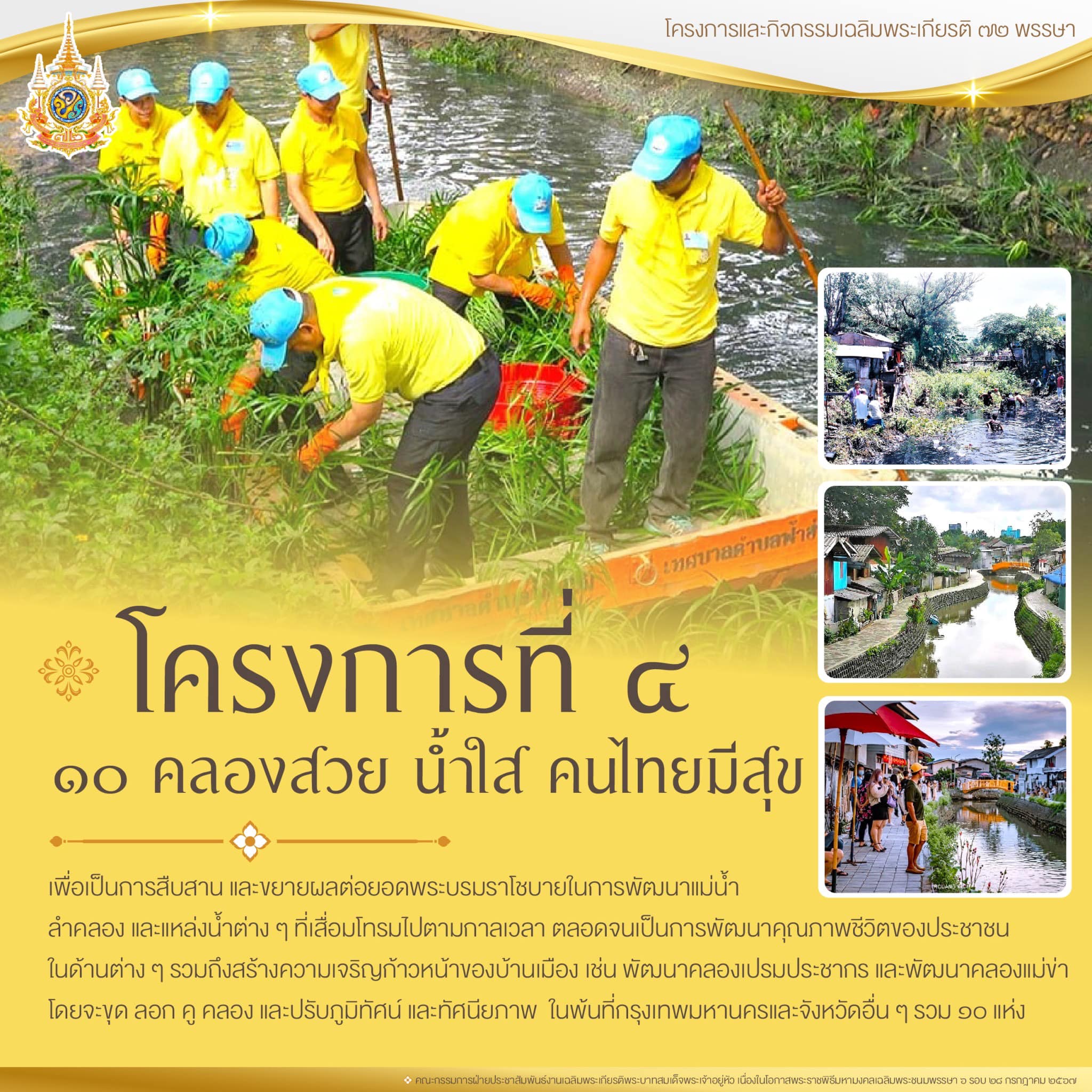 โครงการที่ 4 โครงการ “10 คลองสวย น้ำใส คนไทยมีสุข” เฉลิมพระเกียรติพระบาทสมเด็จพระเจ้าอยู่หัว เนื่องในโอกาสพระราชพิธีมหามงคลเฉลิมพระชนมพรรษา 6 รอบ 28 กรกฎาคม 2567 เพื่อเป็นการสืบสานและขยายผลต่อยอดพระบรมราโชบายในการพัฒนาแม่น้ำ ลำคลอง และแหล่งน้ำต่าง ๆ ที่เสื่อมโทรมไปตามกาลเวลา ตลอดจนเพื่อเป็นการพัฒนาคุณภาพชีวิตของประชาชนในด้านต่าง ๆ รวมถึงสร้างความเจริญก้าวหน้าของบ้านเมือง เช่น โครงการพัฒนาคลองเปรมประชากร และพัฒนาคลองแม่ข่า รัฐบาลได้มอบหมายให้กระทรวงมหาดไทยจัดทำโครงการพัฒนาแม่น้ำ คู คลองทั่วประเทศ โดยเปิดโอกาสให้ทุกภาคส่วนได้เข้ามามีส่วนร่วมในการดำเนินการตั้งแต่ขุดลอกคู คลอง ปรับภูมิทัศน์ และทัศนียภาพ รวมถึงพัฒนาคุณภาพชีวิตประชาชนตลอดสองฝั่งคลอง ได้แก่ การจัดระเบียบที่อยู่อาศัยใหม่ ความสะอาดของทางเดิน และถนน การกำจัดขยะ การพัฒนาระบบสาธารณูปโภค การเพิ่มพื้นที่สีเขียว และระบบการระบายน้ำ โดยจะดำเนินการนำร่องในพื้นที่กรุงเทพมหานคร และจังหวัดอื่น ๆ ทั่วประเทศ