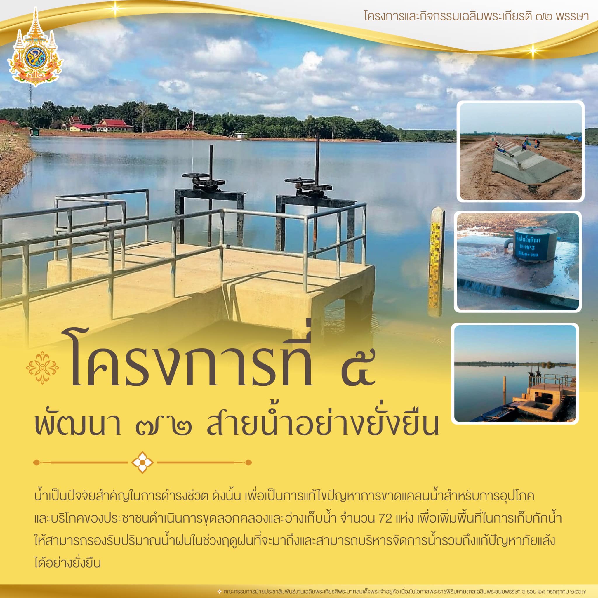 โครงการที่ 5 โครงการพัฒนา 72 สายน้ำอย่างยั่งยืน เฉลิมพระเกียรติพระบาทสมเด็จพระเจ้าอยู่หัว เนื่องในโอกาสพระราชพิธีมหามงคลเฉลิมพระชนมพรรษา 6 รอบ 28 กรกฎาคม 2567 ด้วยรัฐบาลเล็งเห็นว่า น้ำเป็นปัจจัยสำคัญในการดำรงชีวิต ดังนั้น เพื่อเป็นการแก้ไขปัญหาการขาดแคลนน้ำสำหรับการอุปโภค และบริโภคของประชาชน จึงได้มอบหมายให้กระทรวงเกษตรและสหกรณ์ดำเนินการขุดลอกคลองและอ่างเก็บน้ำ จำนวนทั้งสิ้น 72 แห่ง เพื่อเพิ่มพื้นที่ในการเก็บกักน้ำให้สามารถรองรับปริมาณน้ำฝนในช่วงฤดูฝนที่จะมาถึงและสามารถบริหารจัดการน้ำรวมถึงแก้ปัญหาภัยแล้งได้อย่างยั่งยืน