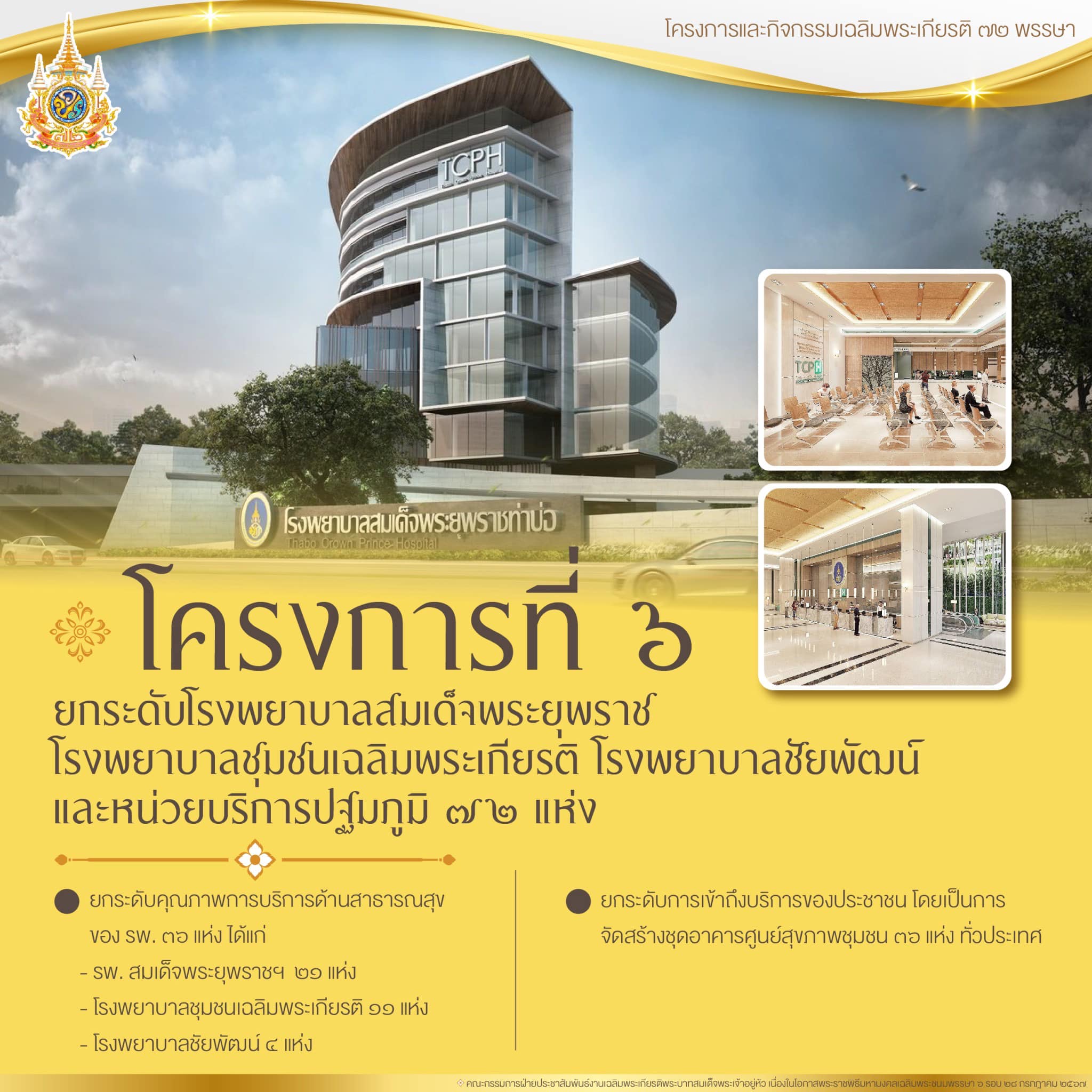 โครงการที่ 6 โครงการยกระดับโรงพยาบาลสมเด็จพระยุพราช โรงพยาบาลชุมชนเฉลิมพระเกียรติ โรงพยาบาลชัยพัฒน์ และหน่วยบริการปฐมภูมิ 72 แห่ง เฉลิมพระเกียรติพระบาทสมเด็จพระเจ้าอยู่หัว เนื่องในโอกาสพระราชพิธีมหามงคลเฉลิมพระชนมพรรษา 6 รอบ 28 กรกฎาคม 2567 เพื่อเป็นการยกระดับคุณภาพการให้บริการและการเข้าถึงการบริการด้านสาธารณสุขลดความแออัด ลดระยะในการรอคอยการเข้ารับการบริการของประชาชน รวมถึงมีสถานที่ที่เอื้อต่อการส่งเสริมสุขภาพเพื่อคุณภาพชีวิตที่ดีของประชาชน รัฐบาลมอบหมายให้กระทรวงสาธารณสุขยกระดับการขยายบริการทางการแพทย์ และขยายศักยภาพในการรักษาผู้ป่วยเฉพาะทางที่มีความซ้ำซ้อน และลดการส่งต่อผู้ป่วย โดยจะดำเนินการทั้งสิ้น 72 แห่ง แบ่งเป็น 1. การยกระดับคุณภาพการบริการของโรงพยาบาล 36 แห่ง ได้แก่ รพ.สมเด็จพระยุพราชฯ 21 แห่ง รพ.ชุมชนเฉลิมพระเกียรติ 11 แห่ง และ รพ.ชัยพัฒน์ 4 แห่ง 2. การยกระดับการเข้าถึงบริการของประชาชน โดยเป็นการจัดสร้างชุดอาคารศูนย์สุขภาพชุมชน 36 แห่ง ทั่วประเทศ