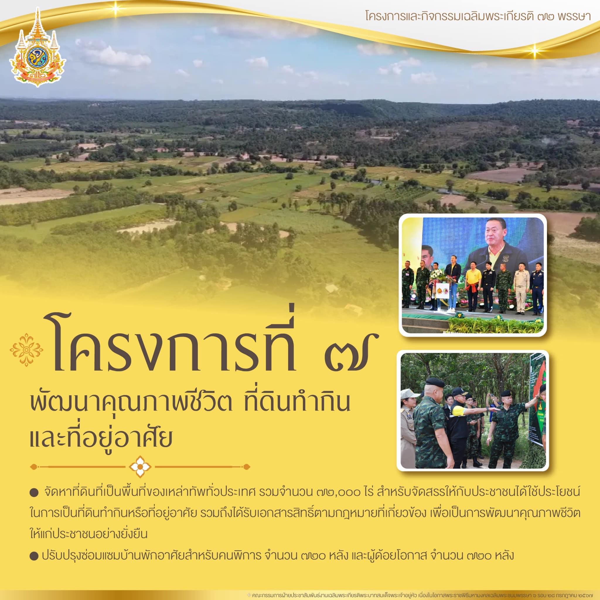 โครงการที่ 7 โครงการพัฒนาคุณภาพชีวิต ที่ดินทำกิน และที่อยู่อาศัย เฉลิมพระเกียรติพระบาทสมเด็จพระเจ้าอยู่หัว เนื่องในโอกาสพระราชพิธีมหามงคลเฉลิมพระชนมพรรษา 6 รอบ 28 กรกฎาคม 2567 เพื่อเป็นการพัฒนาคุณภาพชีวิต ช่วยเหลือและให้โอกาสแก่ประชาชนผู้ด้อยโอกาสรวมถึงผู้พิการหรือทุพพลภาพในการที่จะได้รับสิทธิขั้นพื้นฐาน อันได้แก่ ที่พักอาศัย หรือที่ดินทำกิน สำหรับการประกอบอาชีพเพื่อให้สามารถพึ่งพาตนเองได้ กระทรวงกลาโหมจึงได้เสนอการดำเนินการ 2 กิจกรรม ได้แก่ 1) การจัดหาที่ดินที่เป็นพื้นที่ของเหล่าทัพทั่วประเทศ รวมจำนวน 72,000 ไร่ สำหรับจัดสรรให้กับประชาชนได้ใช้ประโยชน์ในการเป็นที่ดินทำกินหรือที่อยู่อาศัย รวมถึงได้รับเอกสารสิทธิ์ตามกฎหมายที่เกี่ยวข้อง เพื่อเป็นการพัฒนาคุณภาพชีวิตให้แก่ประชาชนอย่างยั่งยืน และ 2) การปรับปรุงซ่อมแซมบ้านพักอาศัยสำหรับคนพิการ จำนวน 720 หลัง และผู้ด้อยโอกาส จำนวน 720 หลัง