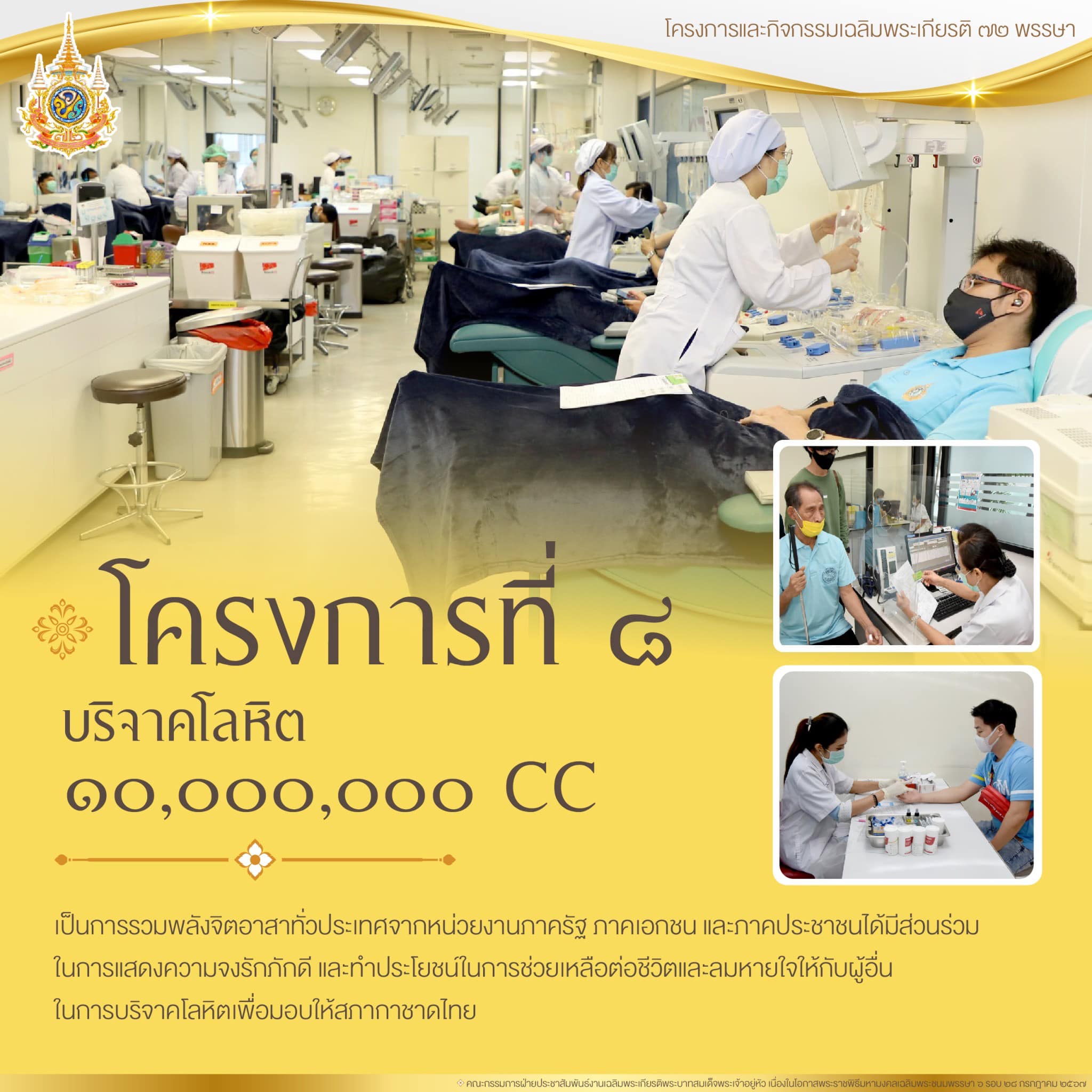 โครงการที่ 8 โครงการบริจาคโลหิต 10,000,000 CC เฉลิมพระเกียรติพระบาทสมเด็จพระเจ้าอยู่หัว เนื่องในโอกาสพระราชพิธีมหามงคลเฉลิมพระชนมพรรษา 6 รอบ 28 กรกฎาคม 2567 เพื่อเป็นการเปิดโอกาสให้ภาครัฐ ภาคเอกชน และภาคประชาชนได้มีส่วนร่วมในการแสดงความจงรักภักดี และทำประโยชน์ในการช่วยเหลือต่อชีวิตและลมหายใจให้กับผู้อื่น เพื่อถวายเป็นพระราชกุศล ในการนี้ รัฐบาลจึงได้จัดทำโครงการเพื่อเป็นการรวมพลังจิตอาสาทั่วประเทศจากทุกภาคส่วนในการบริจาคโลหิต โดยมีเป้าหมายในการรับบริจาคครั้งนี้ จำนวน 10 ล้าน CC เพื่อมอบให้แก่สภากาชาดไทยสำหรับใช้เป็นโลหิตสำรองให้กับผู้ป่วยในโรงพยาบาลต่างๆ ทั่วประเทศ