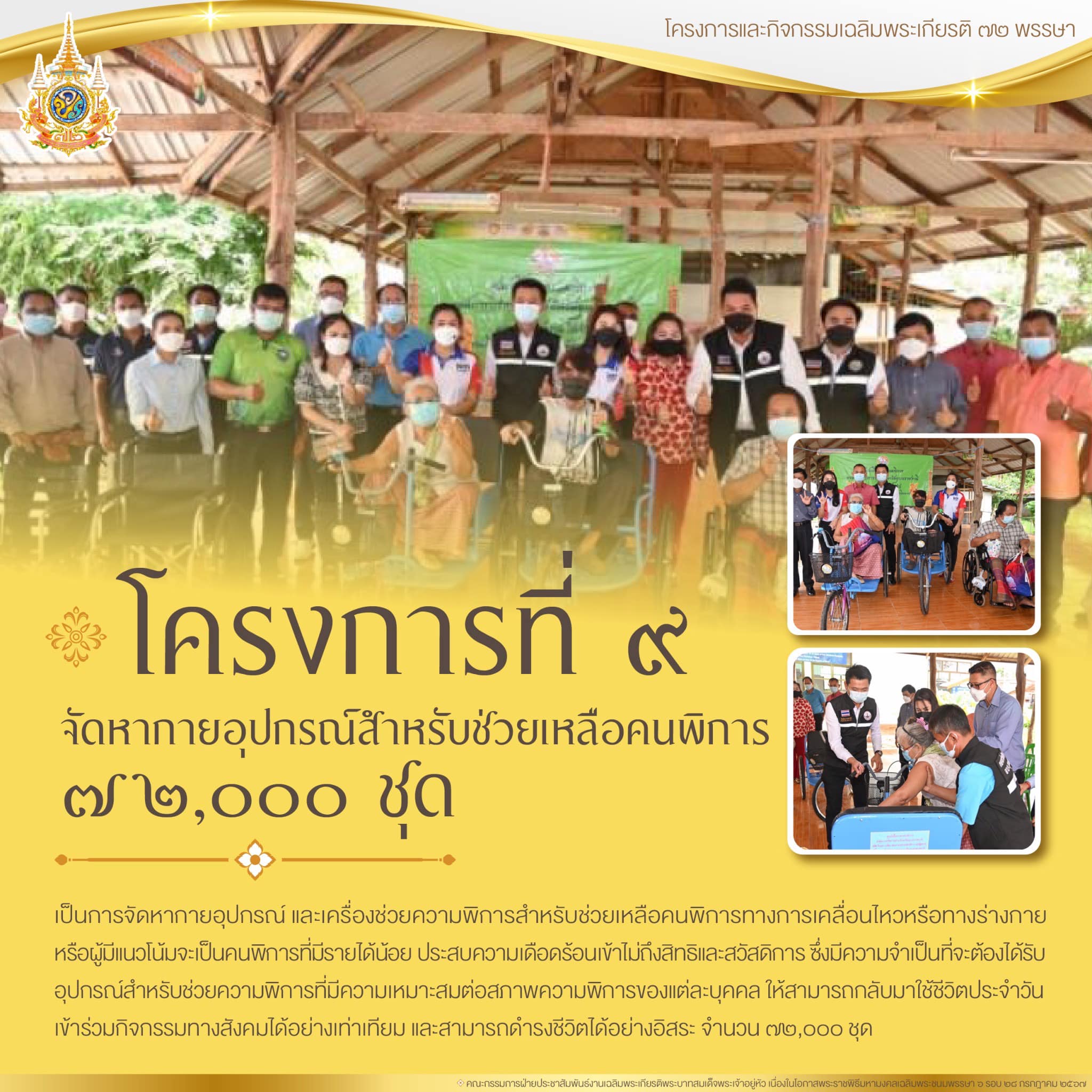 โครงการที่ 9 โครงการจัดหากายอุปกรณ์สำหรับช่วยเหลือคนพิการ 72,000 ชุด เฉลิมพระเกียรติพระบาทสมเด็จพระเจ้าอยู่หัว เนื่องในโอกาสพระราชพิธีมหามงคลเฉลิมพระชนมพรรษา 6 รอบ 28 กรกฎาคม 2567 เพื่อเป็นการช่วยเหลือผู้พิการทางการเคลื่อนไหวหรือทางร่างกาย หรือผู้มีแนวโน้มจะเป็นคนพิการที่มีรายได้น้อยที่ประสบความเดือดร้อนเข้าไม่ถึงสิทธิและสวัสดิการ ให้สามารถกลับมาใช้ชีวิตประจำวันเข้าร่วมกิจกรรมทางสังคมได้อย่างเท่าเทียม และสามารถดำรงชีวิตด้วยตนเองได้อย่างอิสระ กระทรวงการพัฒนาสังคมและความมั่นคงของมนุษย์ จะจัดหากายอุปกรณ์ และเครื่องช่วยความพิการ สำหรับช่วยเหลือคนพิการทางการเคลื่อนไหวหรือทางร่างกายดังกล่าว ที่มีความจำเป็นที่จะต้องได้รับอุปกรณ์สำหรับช่วยความพิการที่มีความเหมาะสมต่อสภาพความพิการของแต่ละบุคคลทั่วประเทศจำนวน 72,000 ชุด