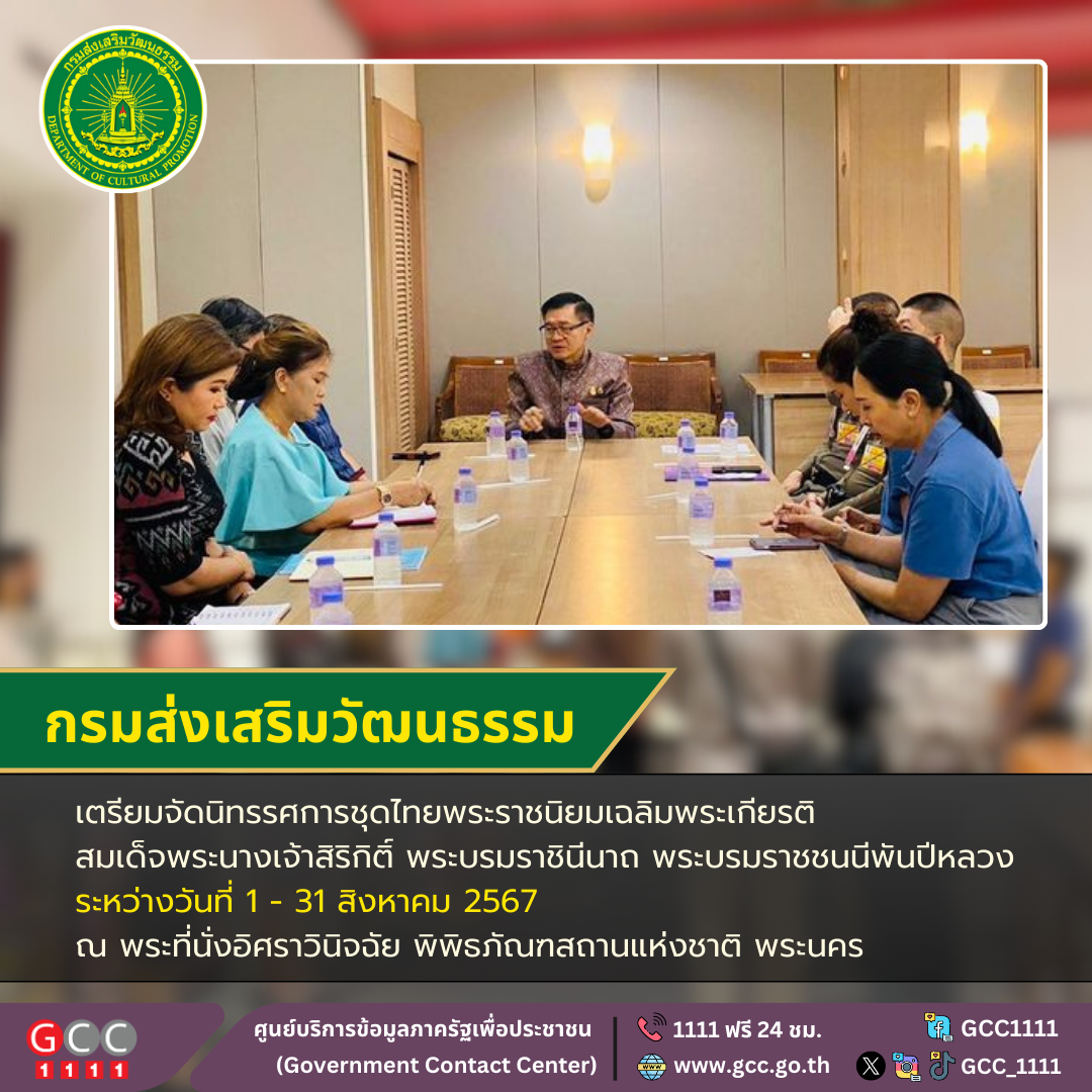 เมื่อวันที่ 31 พฤษภาคม 2567 เวลา 10.00 น. ณ พิพิธภัณฑสถานแห่งชาติ พระนคร นายโกวิท ผกามาศ อธิบดีกรมส่งเสริมวัฒนธรรม พร้อมด้วยนางมงคลทิพย์ รุ่งงามฤกษ์ ผู้อำนวยการสถาบันวัฒนธรรมศึกษา และนางสาวศิวพร ฉันทไกรวัฒน์ ผู้อำนวยการกลุ่มเผยแพร่และต่อยอดมรดกภูมิปัญญาทางวัฒนธรรม ลงพื้นที่และร่วมประชุมปรึกษาหารือกับ พ.อ.ไชยศิริ วิบูลมงคล ผู้อำนวยการกองศิลปาชีพ มูลนิธิส่งเสริมศิลปาชีพในสมเด็จพระนางเจ้าสิริกิติ์ฯ นางปิยวรา ทีขะระ เนตรน้อย ผู้อำนวยการพิพิธภัณฑ์ผ้าในสมเด็จพระนางเจ้าสิริกิติ์ฯ นางณัฏฐวรรณ ตันหยงมาศ รองผู้อำนวยการพิพิธภัณฑ์ผ้าฯ และผู้แทนพิพิธภัณฑสถานแห่งชาติ พระนคร เพื่อจัดนิทรรศการชุดไทยพระราชนิยมเฉลิมพระเกียรติสมเด็จพระนางเจ้าสิริกิติ์ พระบรมราชินีนาถ พระบรมราชชนนีพันปีหลวง เนื่องในวันคล้ายวันพระราชสมภพ 12 สิงหาคม 2567 ในเบื้องต้นกำหนดจัดงาน ระหว่างวันที่ 1 – 31 สิงหาคม 2567 ณ พระที่นั่งอิศราวินิจฉัย พิพิธภัณฑสถานแห่งชาติ พระนคร